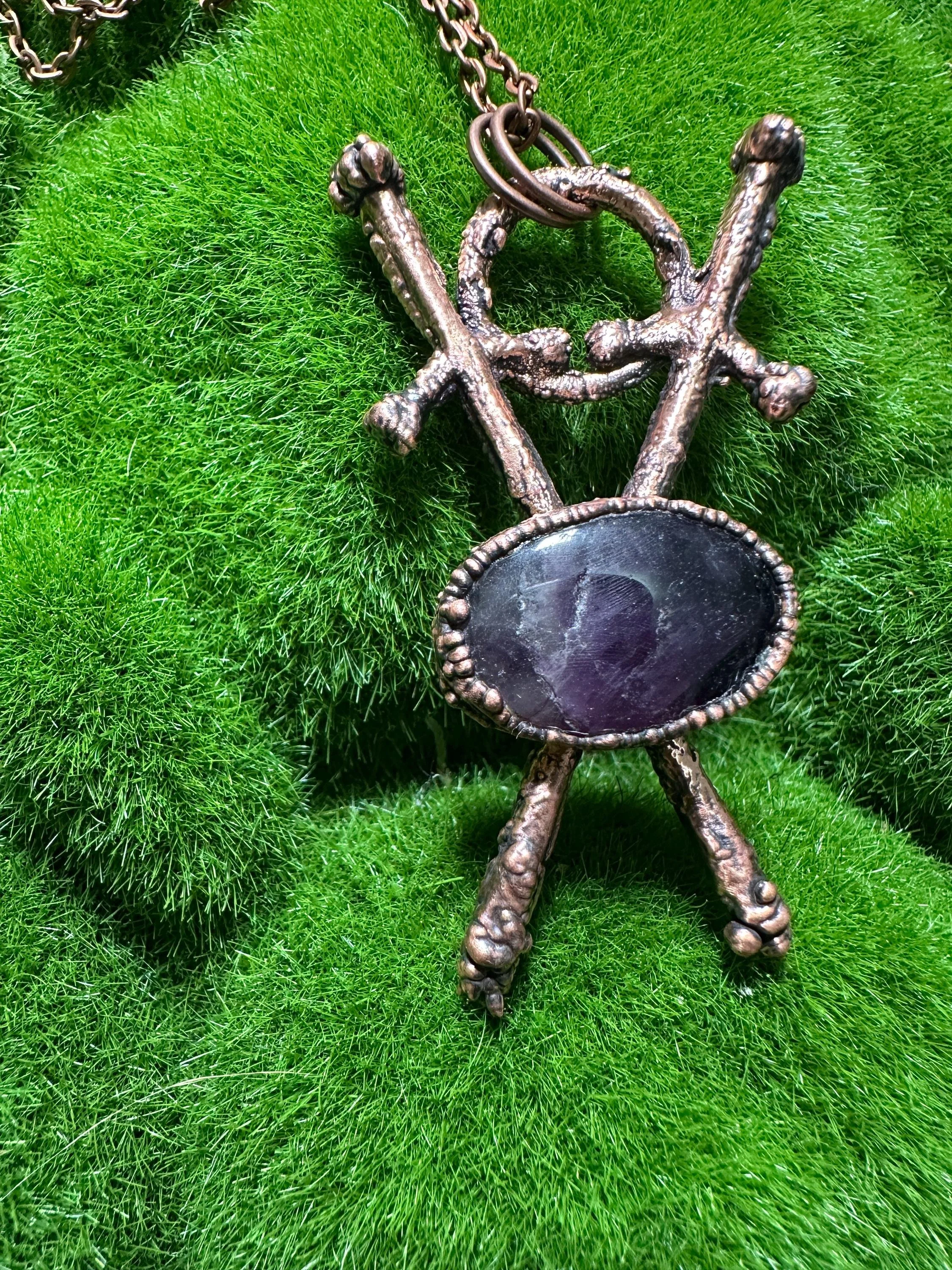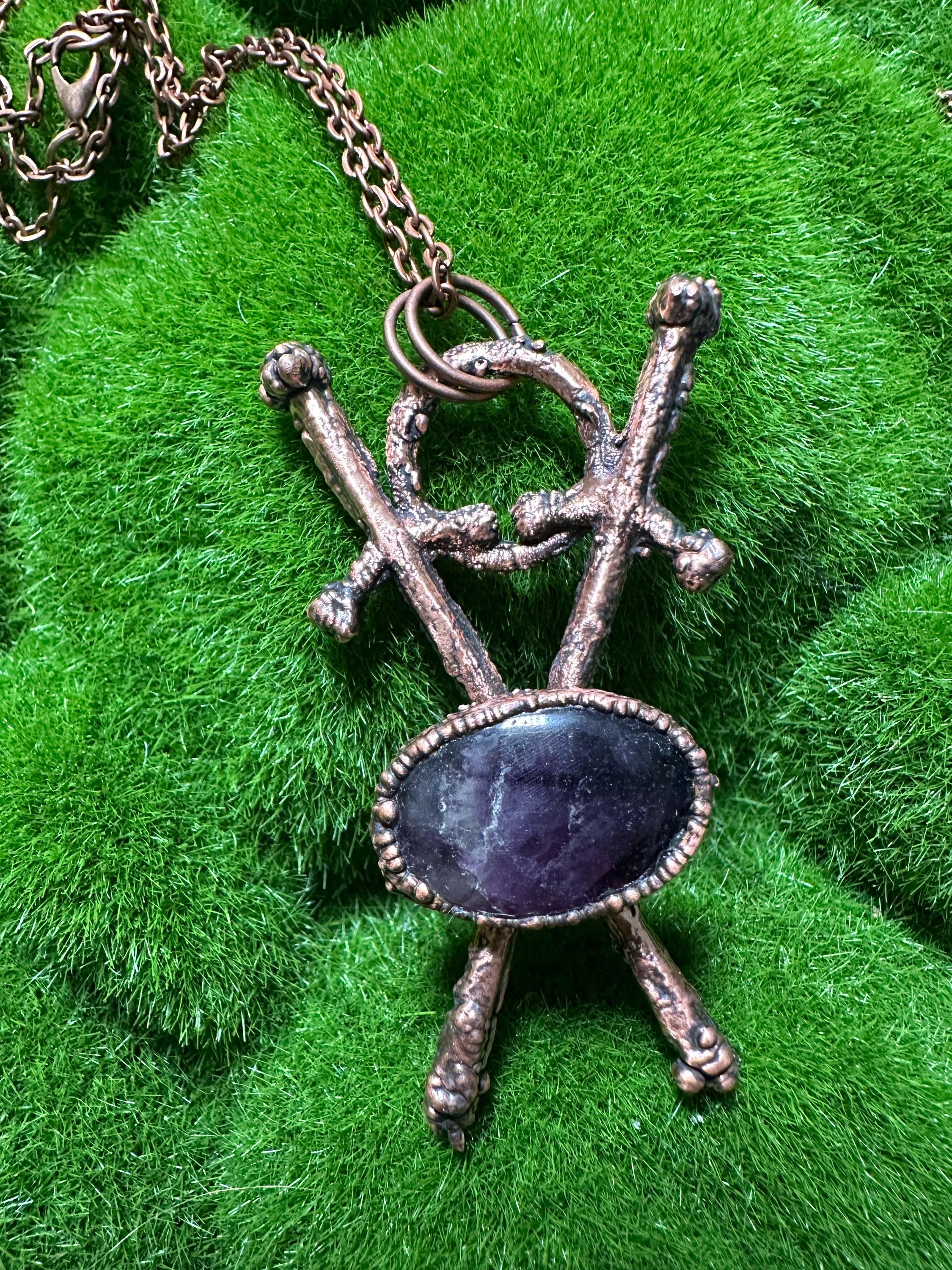 Pendant with two swords crossed and a beautiful amethyst cabochon on top. Electroformed in copper and then put in patina and polished!