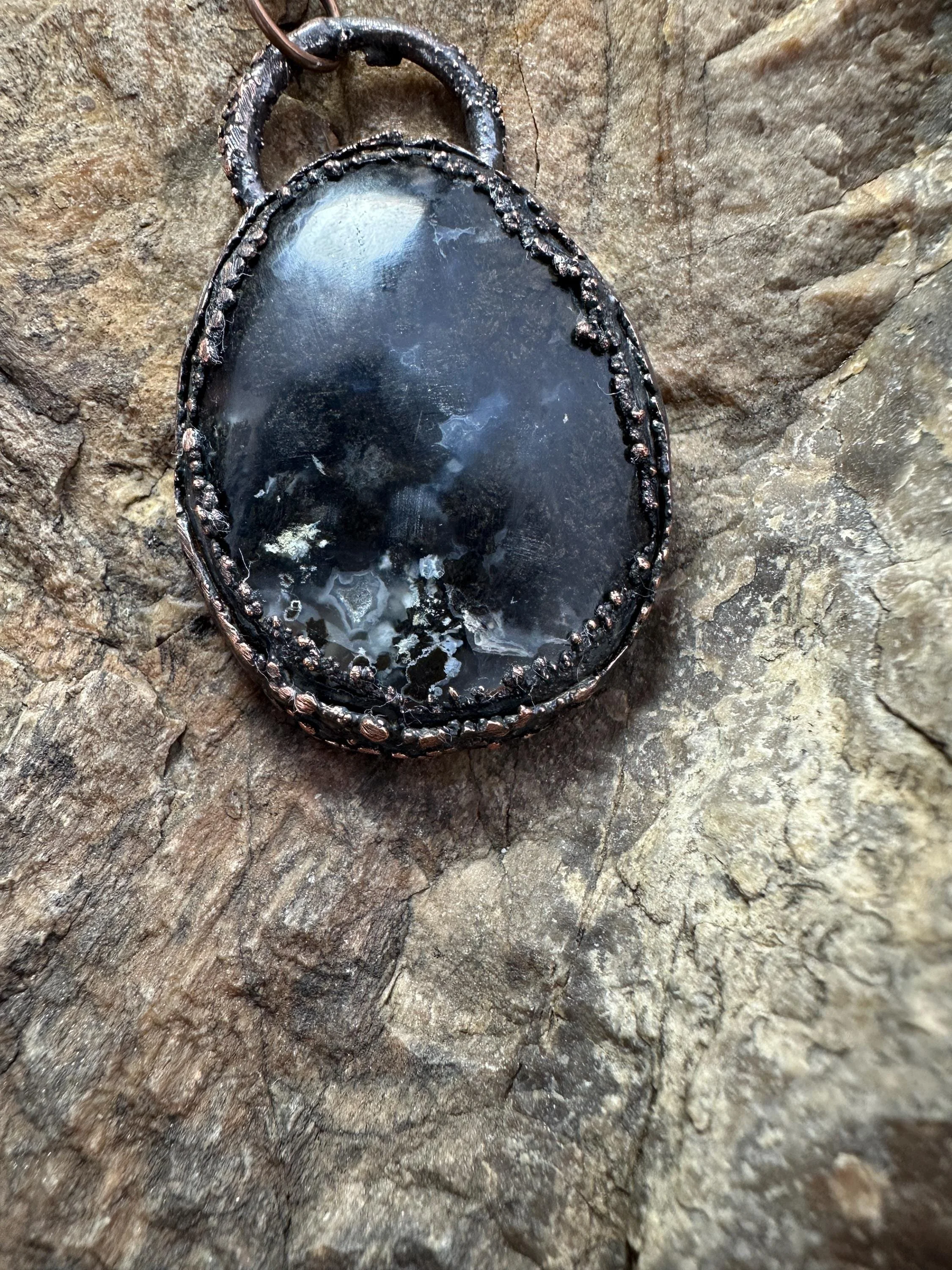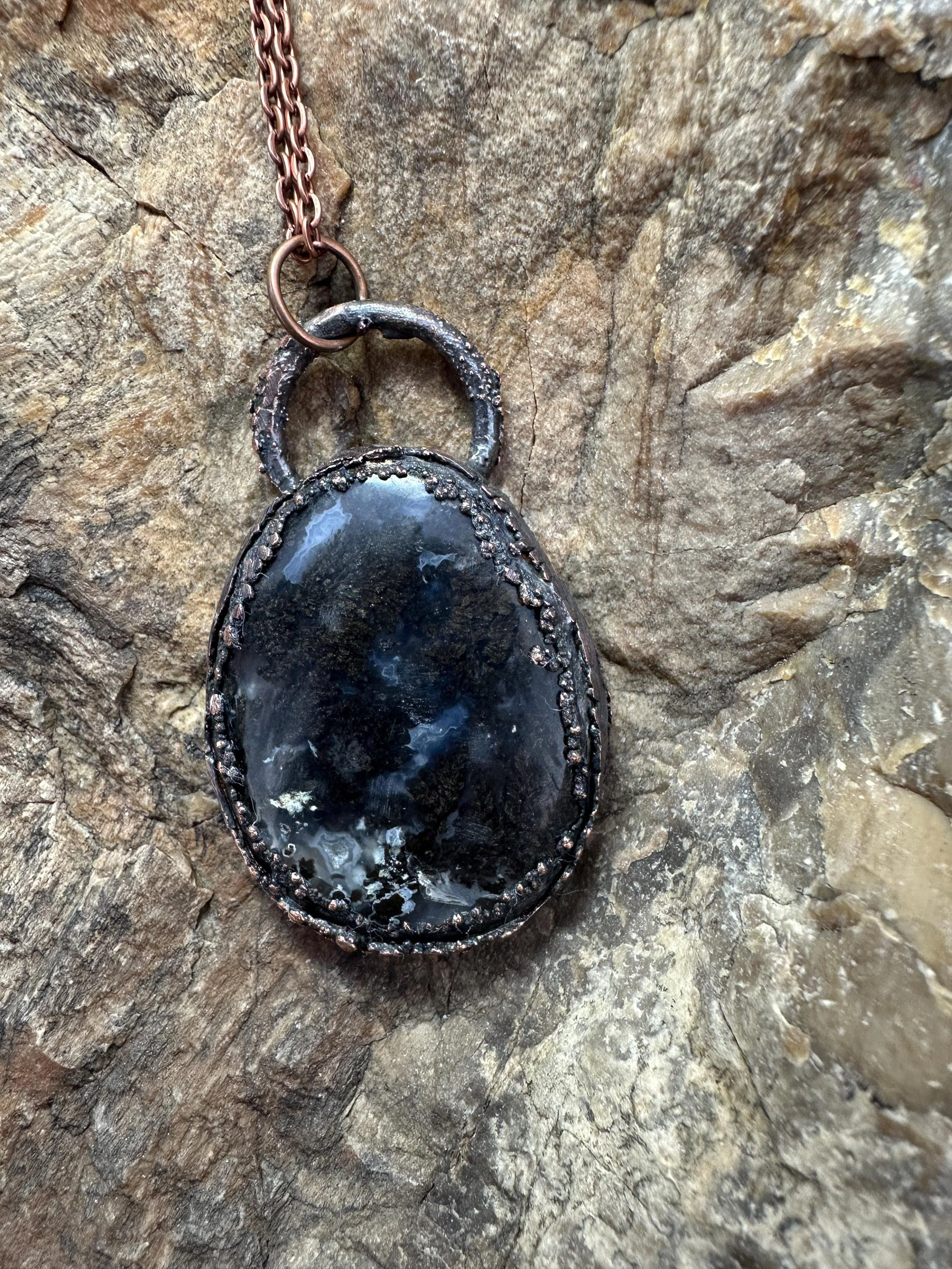 Black Agate Oval Pendant Necklace, Rustic Electroformed Copper Jewelry, Natural Stone Statement Necklace, Handmade Boho Gift for Her or Him