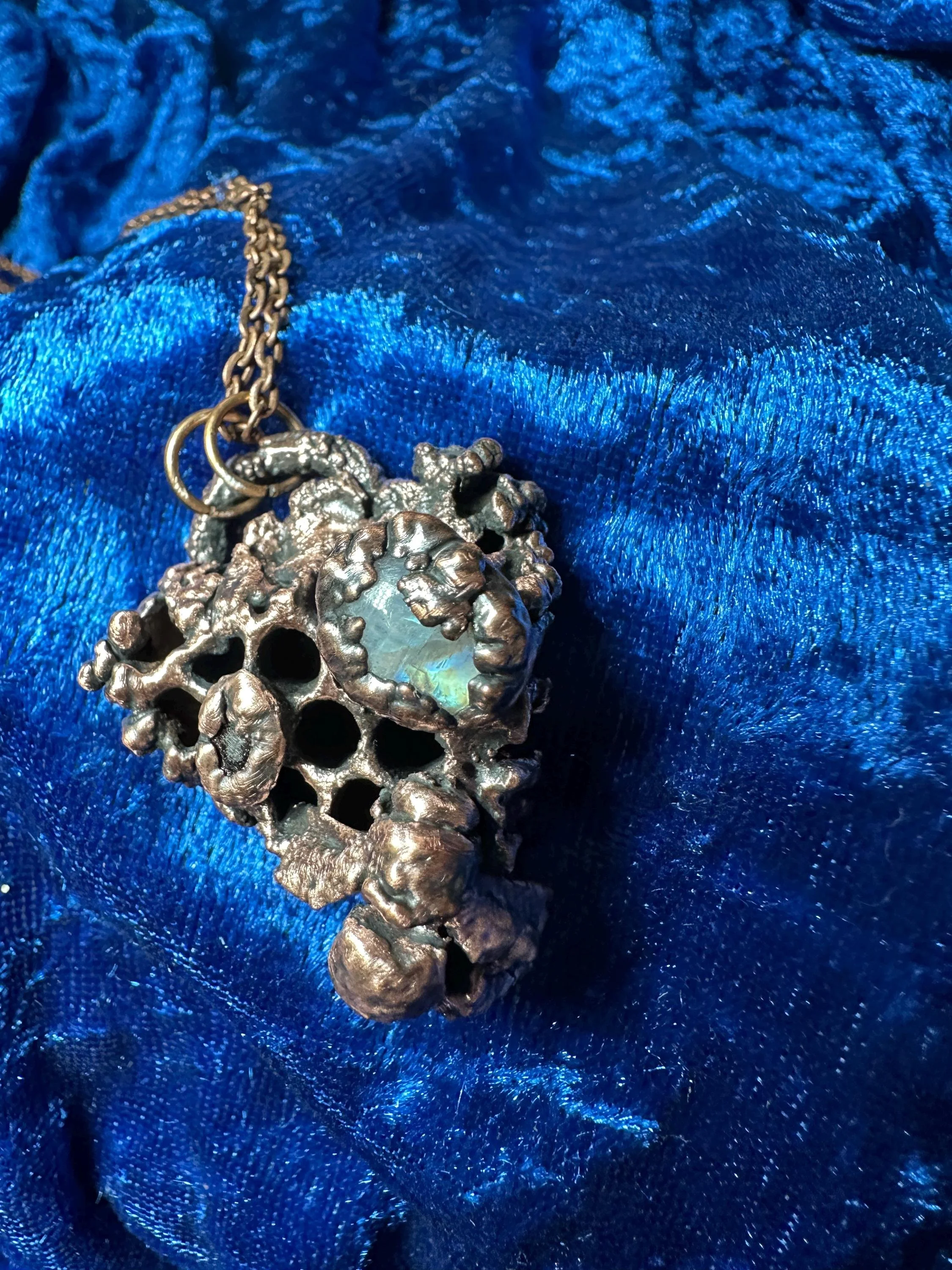 Electroformed Bee Pendant With Honeycomb, Moonstone and Garnet | Garnet Necklace | Moonstone Jewelry | Nature-Inspired Jewelry