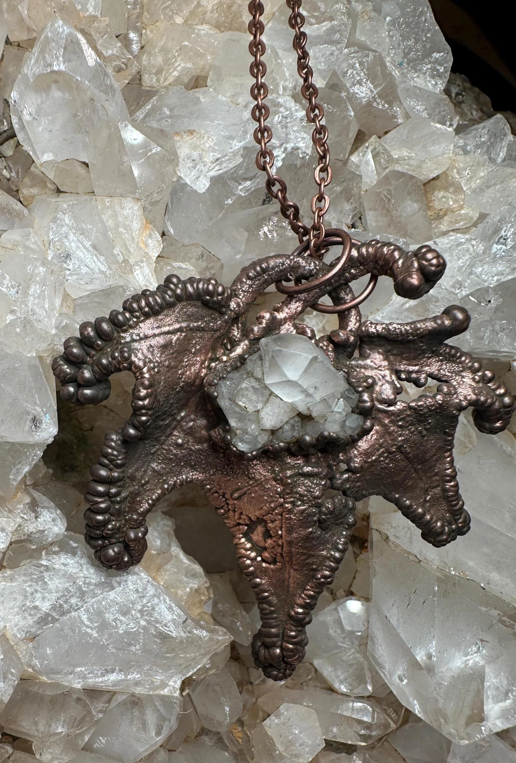 At its center sits a radiant cluster of Arkansas quartz, known for its clarity and energy. The crystals catch light beautifully, reflecting the earthy tones of copper and enhancing the organic charm of the leaf’s shape. Measuring 2.31" x 2.24", this pendant captures natural beauty in wearable form. Details: