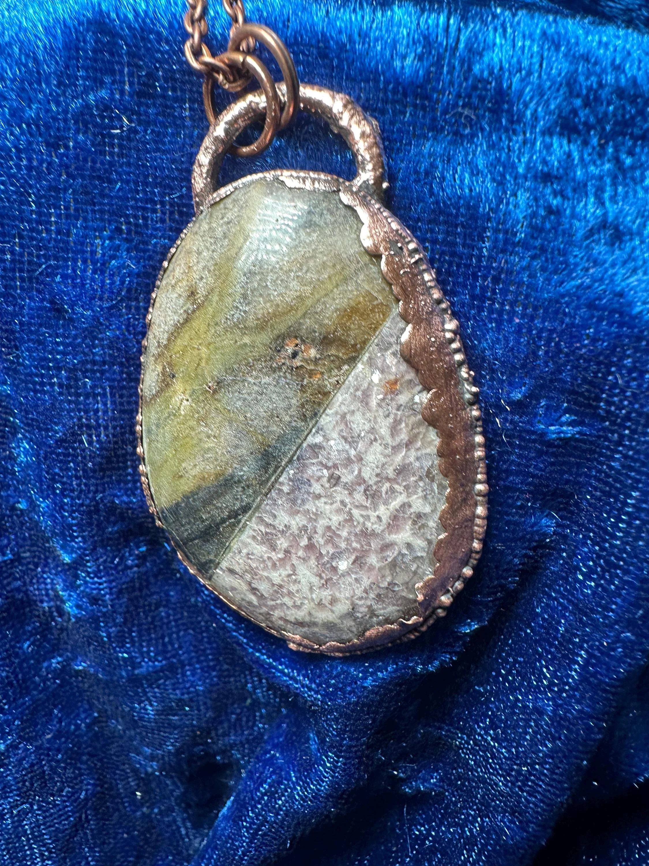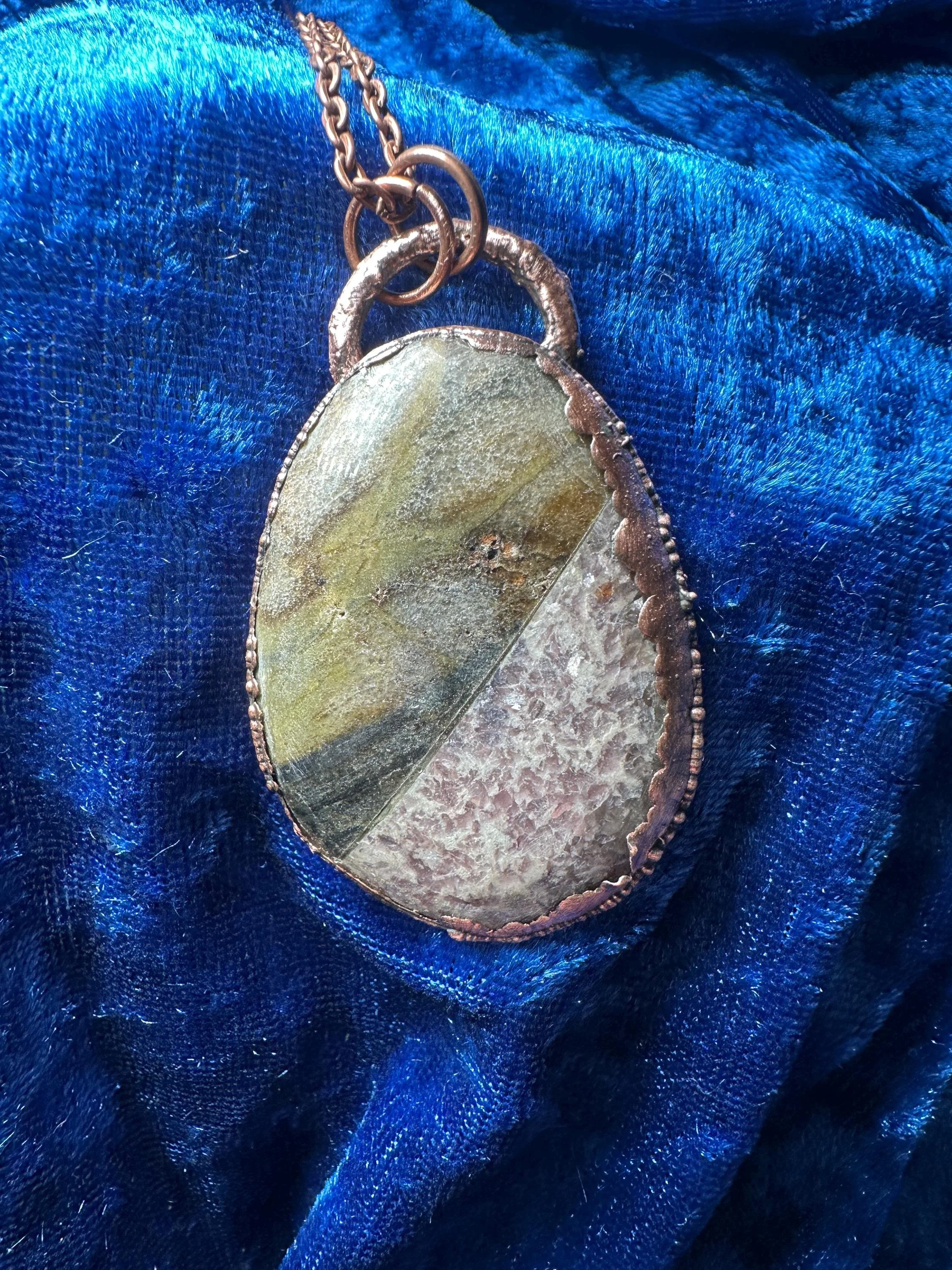 This handcrafted pendant features a striking diagonal split—one half shimmering lavender lepidolite and the other a soothing green serpentine. The oval shape (2" x 1.25") is highlighted with a warm copper electroformed finish that brings out the individual textures and tones of each natural stone. Lepidolite is prized for its calming energy and subtle shine, while serpentine is known for protection and positive renewal.