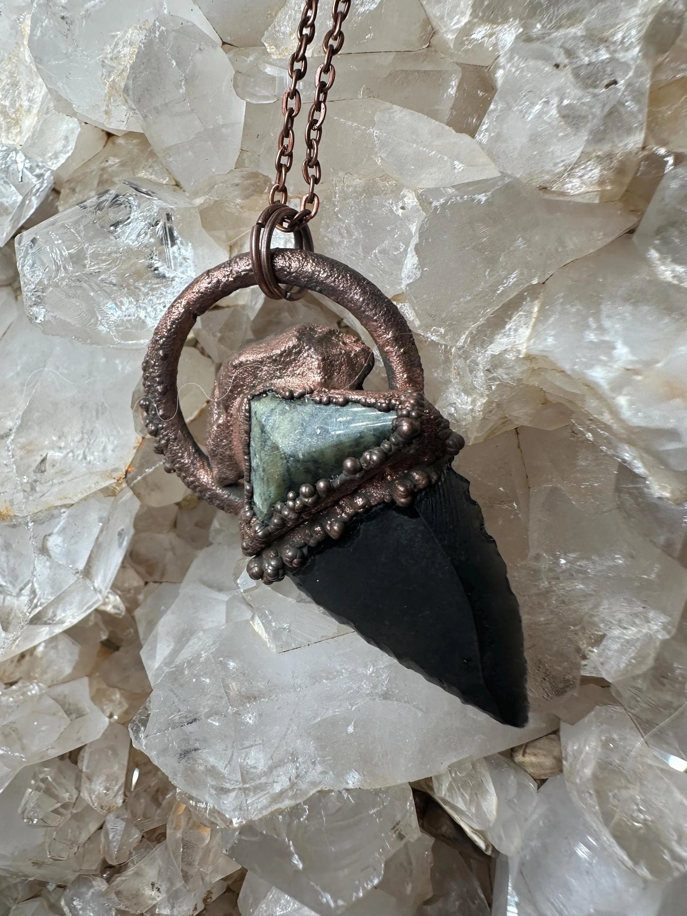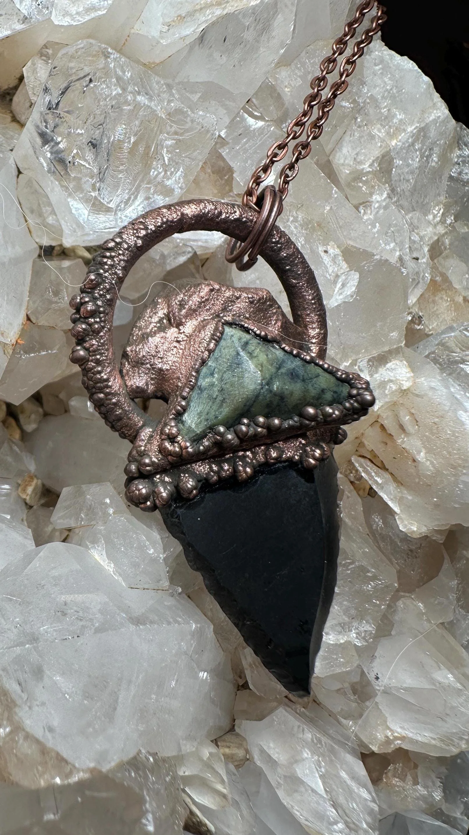 his pendant features a striking obsidian arrowhead, electroformed in copper to highlight its bold edges, and adorned with a triangular cabochon of natural serpentine. Obsidian is revered for its protective and grounding qualities, while serpentine is connected with transformation and positive energy. Together, these stones create a powerful talisman for clarity and strength.