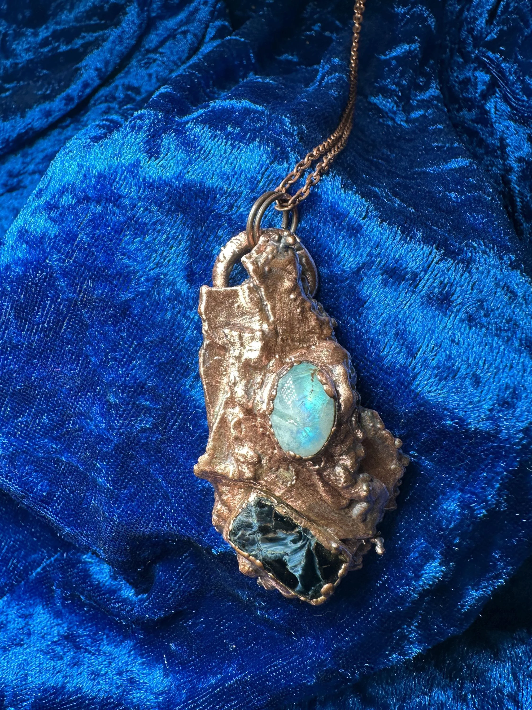 Electroformed Pine Bark Necklace | Moonstone & Pietersite Pendant| Pietersite Pendant | Unique Jewelry | Electroformed Pendant