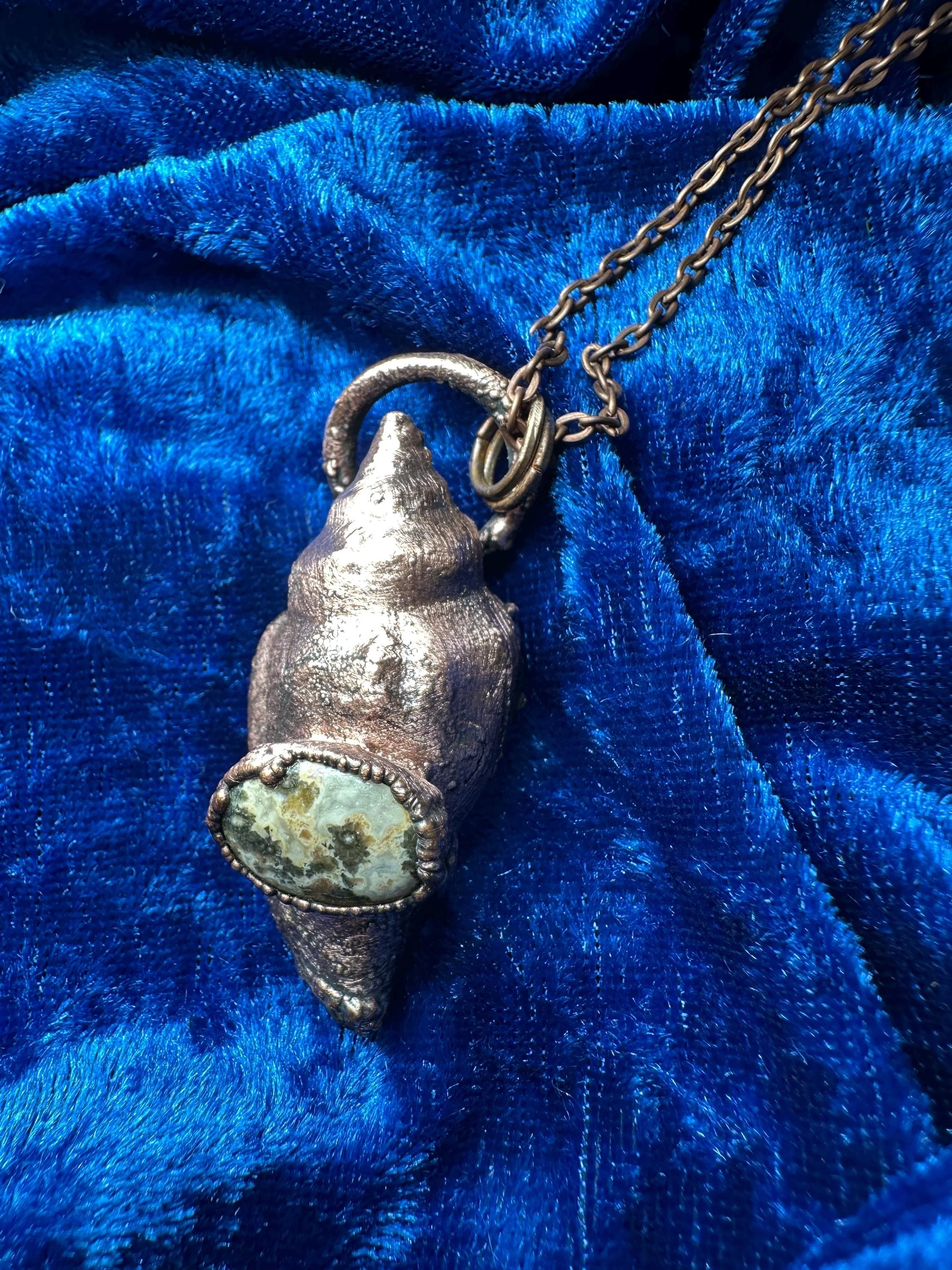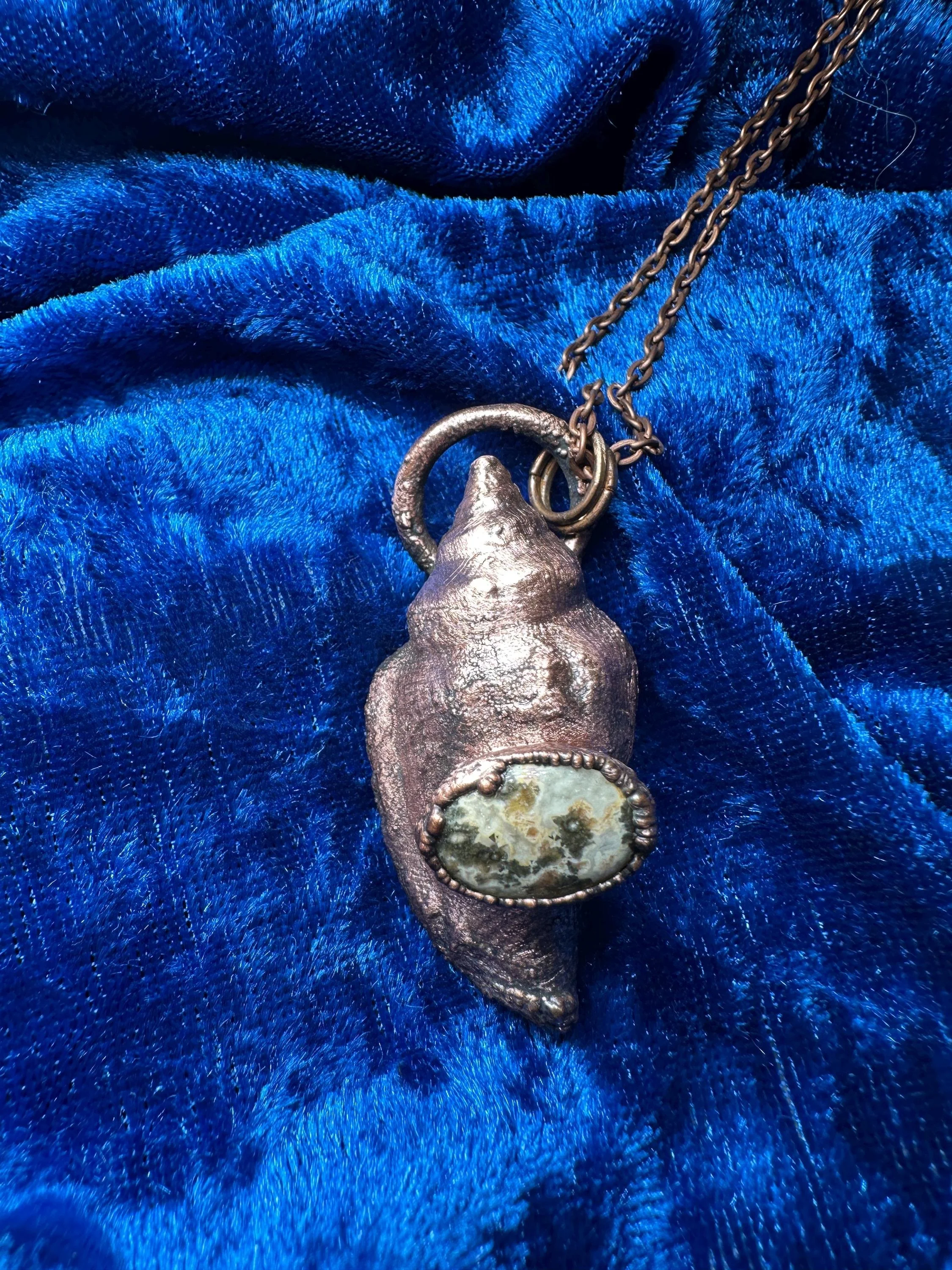 Product Details: - Electroformed REAL seashell -Rainforest Jasper Cabochon Pendant Length: 2” Pendant Width: 0.75” Finish: Antiqued patina with protective sealant