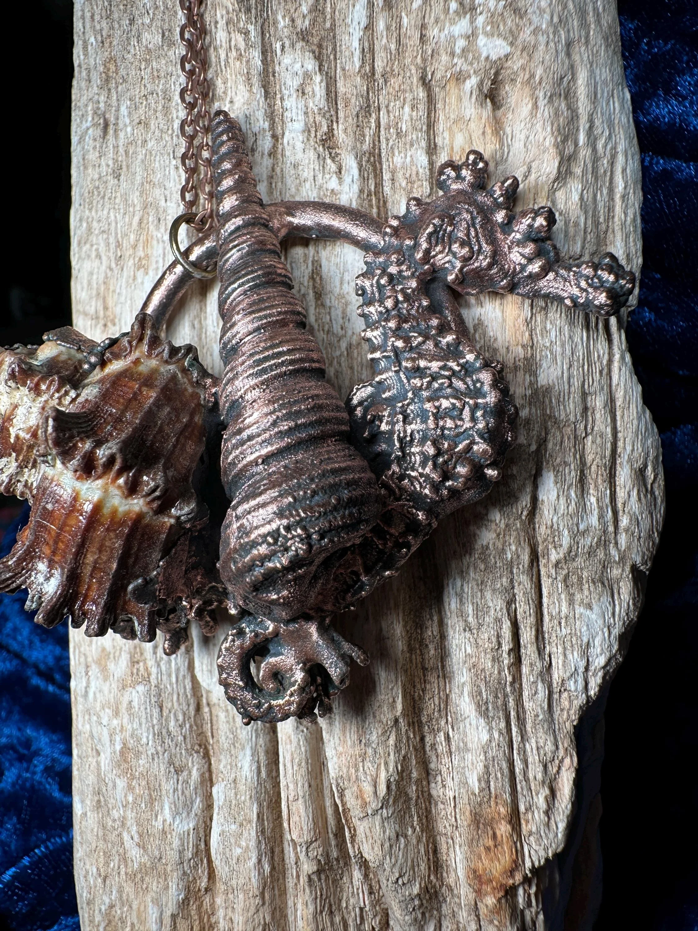 Product Details: - Electroformed 3d printed Sea Horse, a shell that is mounted onto the piece but still raw and visible and a real turritella shell that's fully electroformed. Pendant Length: 3” Pendant Width: 2.16”