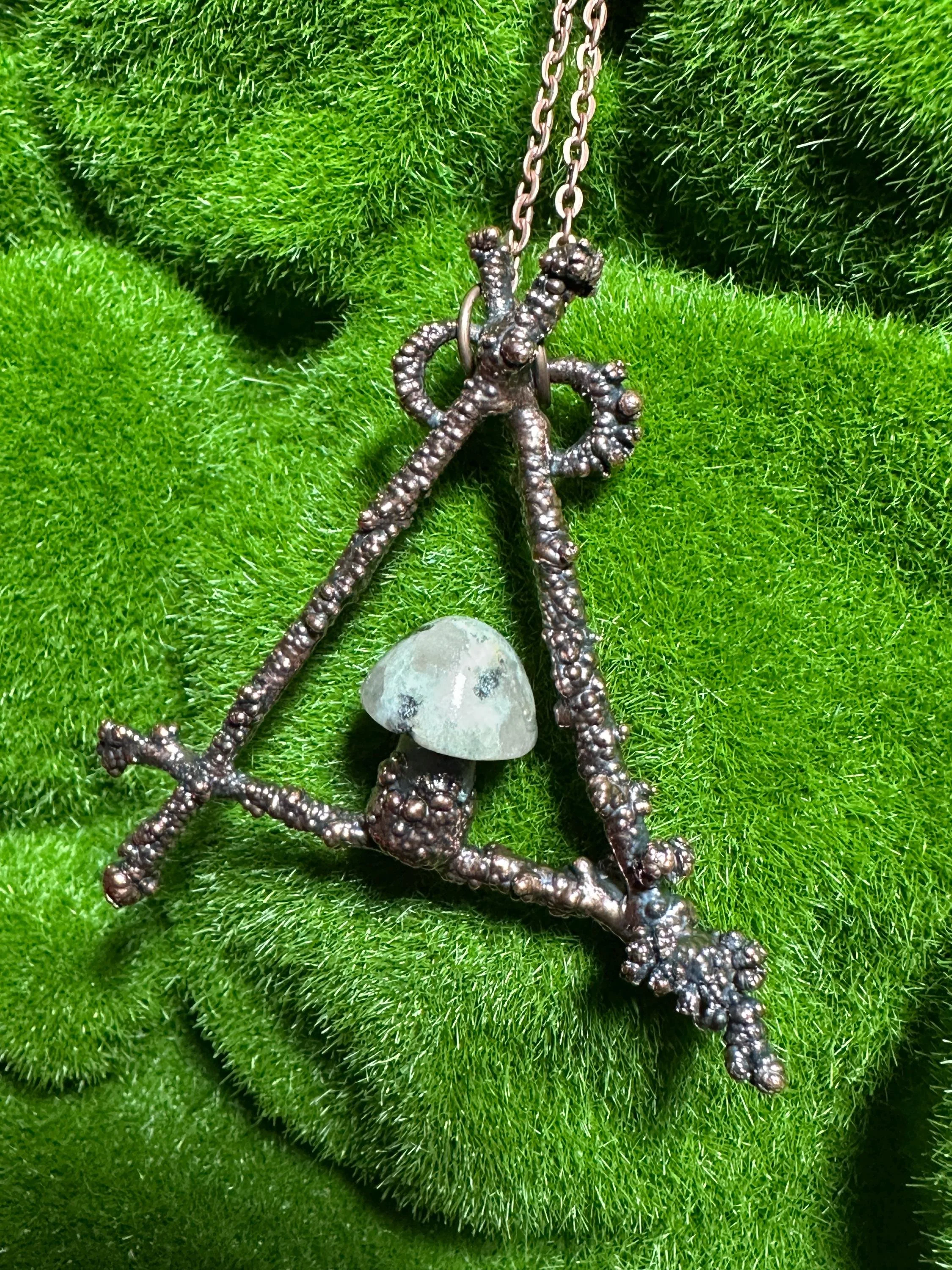 **Enchanting Pine Triangle Necklace with Labradorite Mushroom**