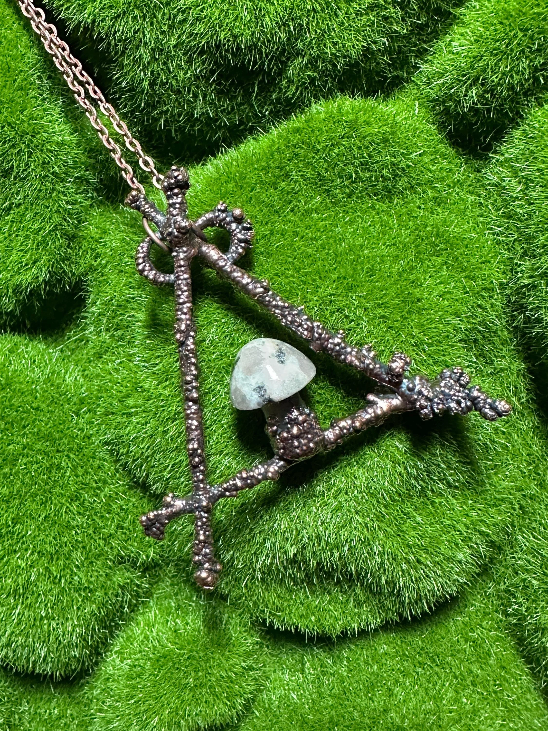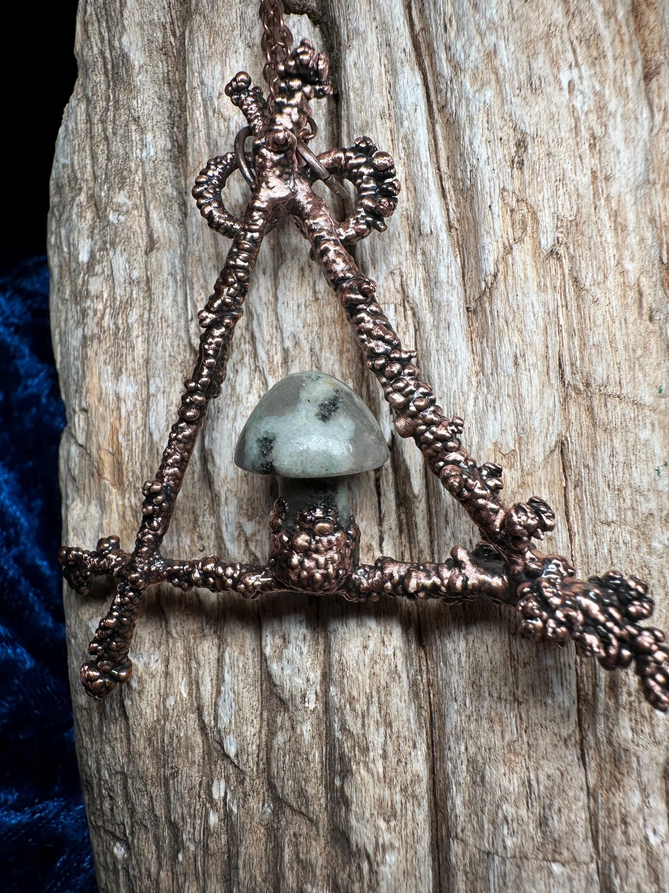 This one-of-a-kind necklace features a pendant handcrafted from pine twigs, artfully arranged into a mystical triangle design. At the heart of the pendant lies a polished labradorite mushroom, glowing with its signature iridescent flash. The natural pine twigs are electroformed in copper and antiqued with patina, giving the piece an earthy yet magical finish.