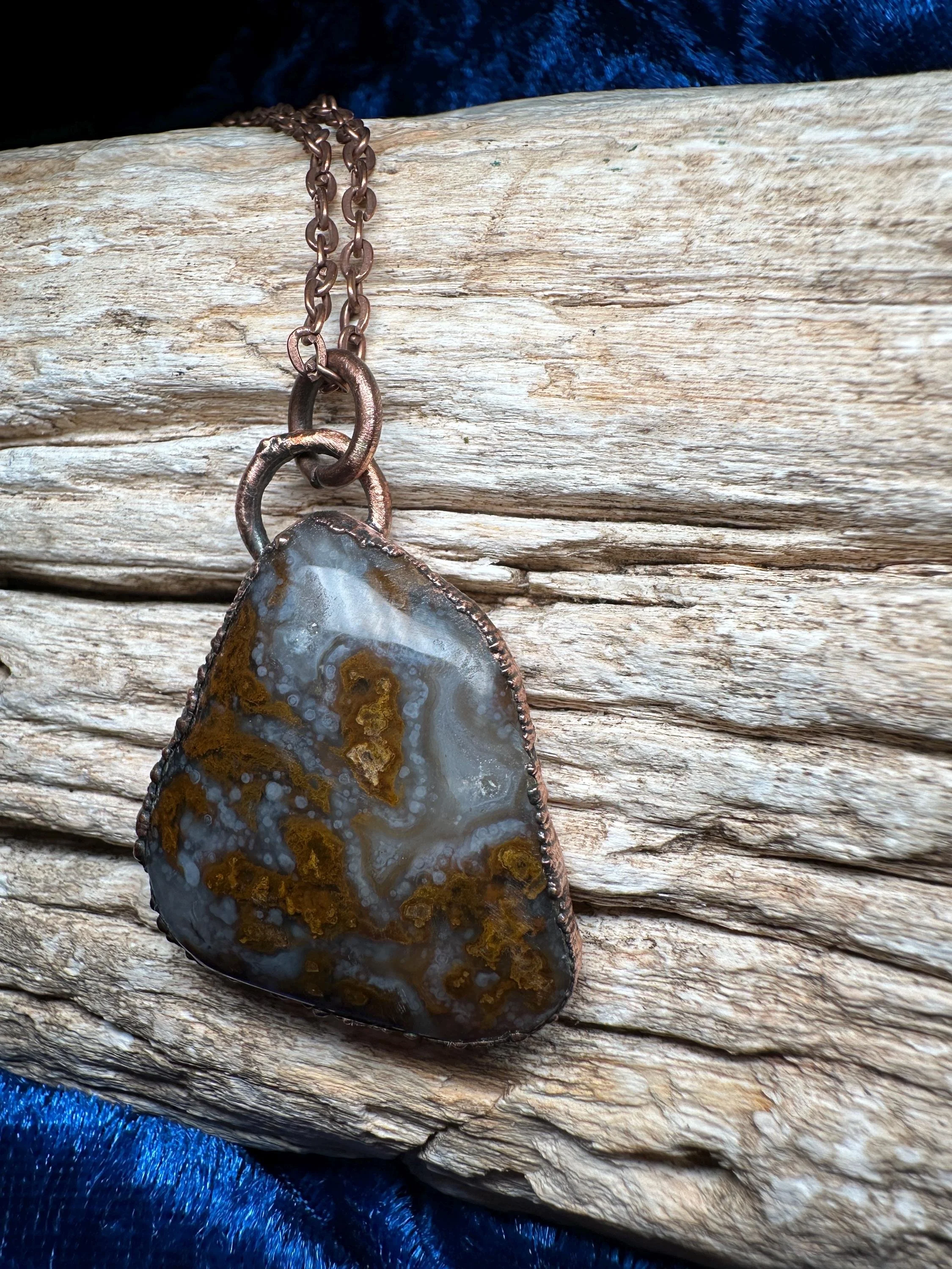 π΅ **Terlingua Treasure: Freeform PomPom Agate Pendant** π΅ This stunning pendant is a one-of-a-kind piece made from PomPom Agate, a striking stone I personally found at Needle Peak in Terlingua, Texas. The freeform shape captures the natural beauty of the stone, showcasing its vibrant patterns and unique textures. Electroformed in copper, this pendant highlights the raw elegance of the agate while adding a rustic touch.
