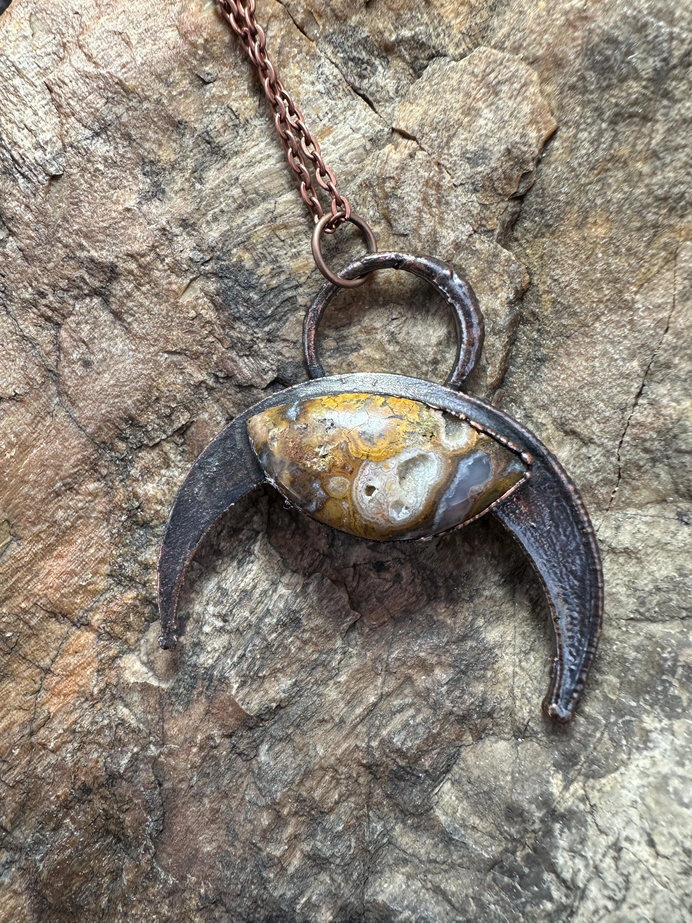 Material: golden moss agate eyeshaped stone with a crescent moon base pendant. I found the golden moss agate outside Alpine, Texas