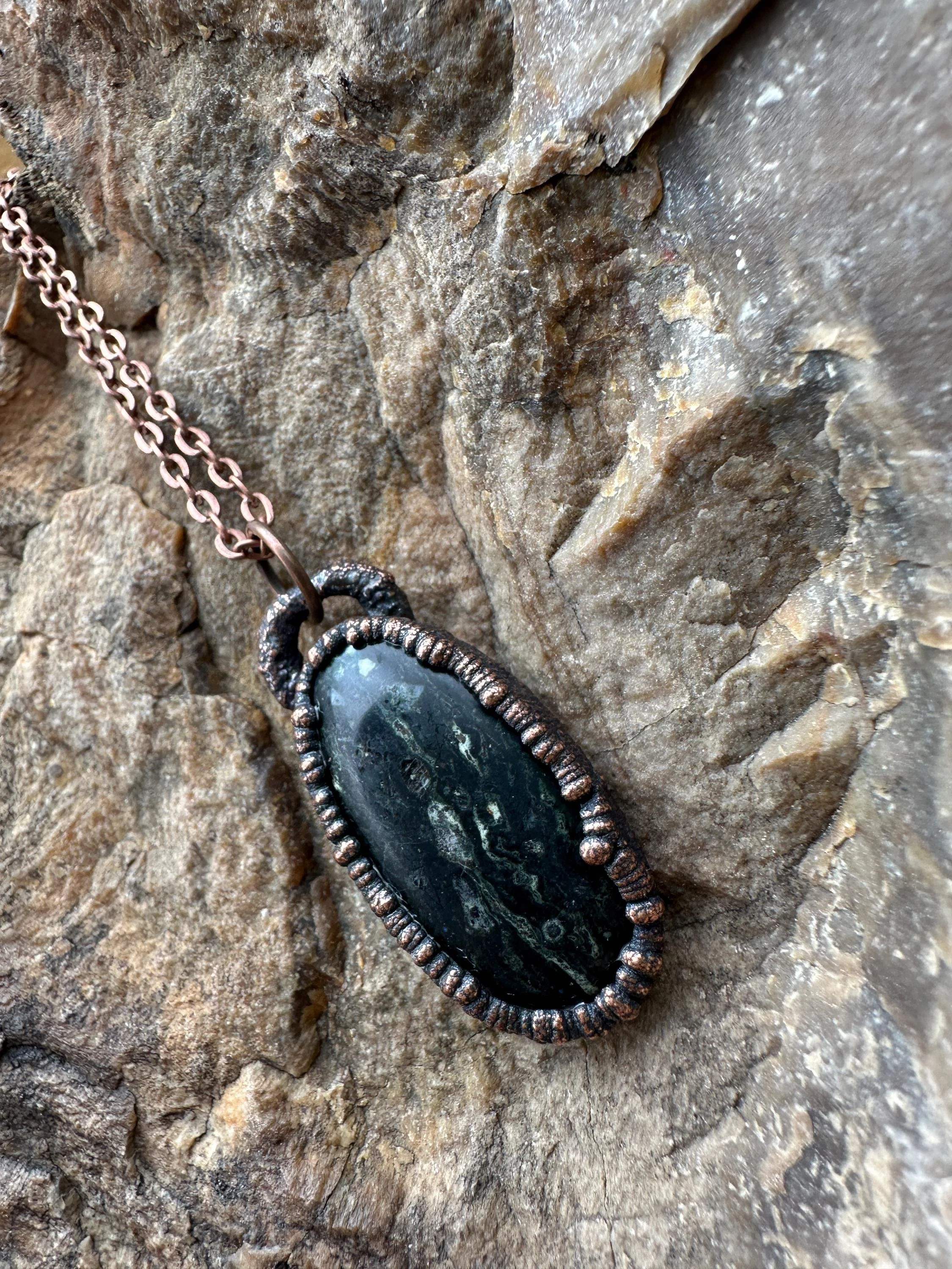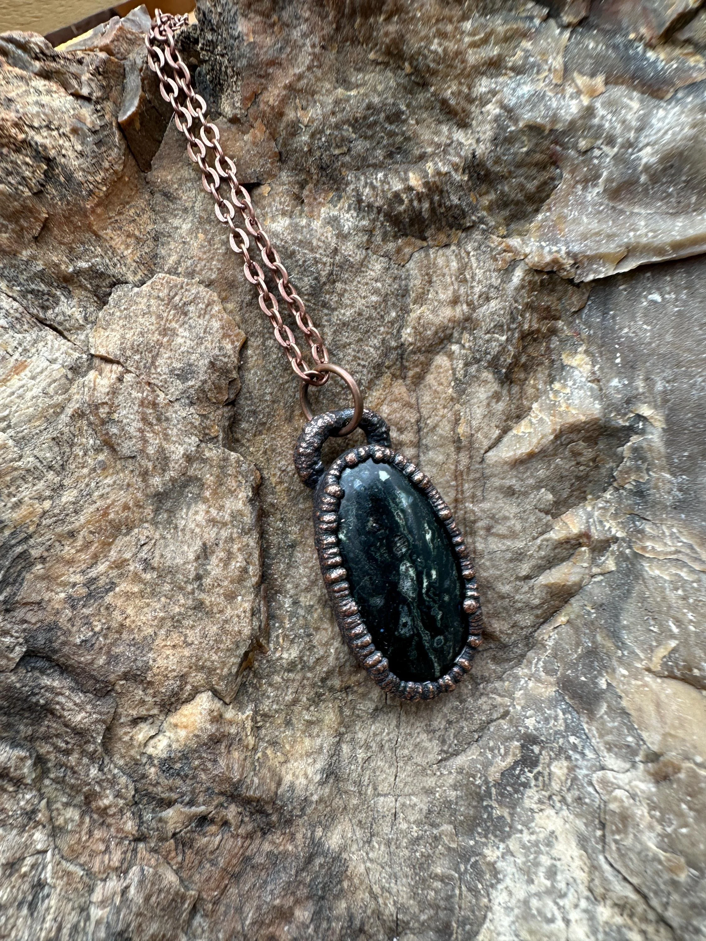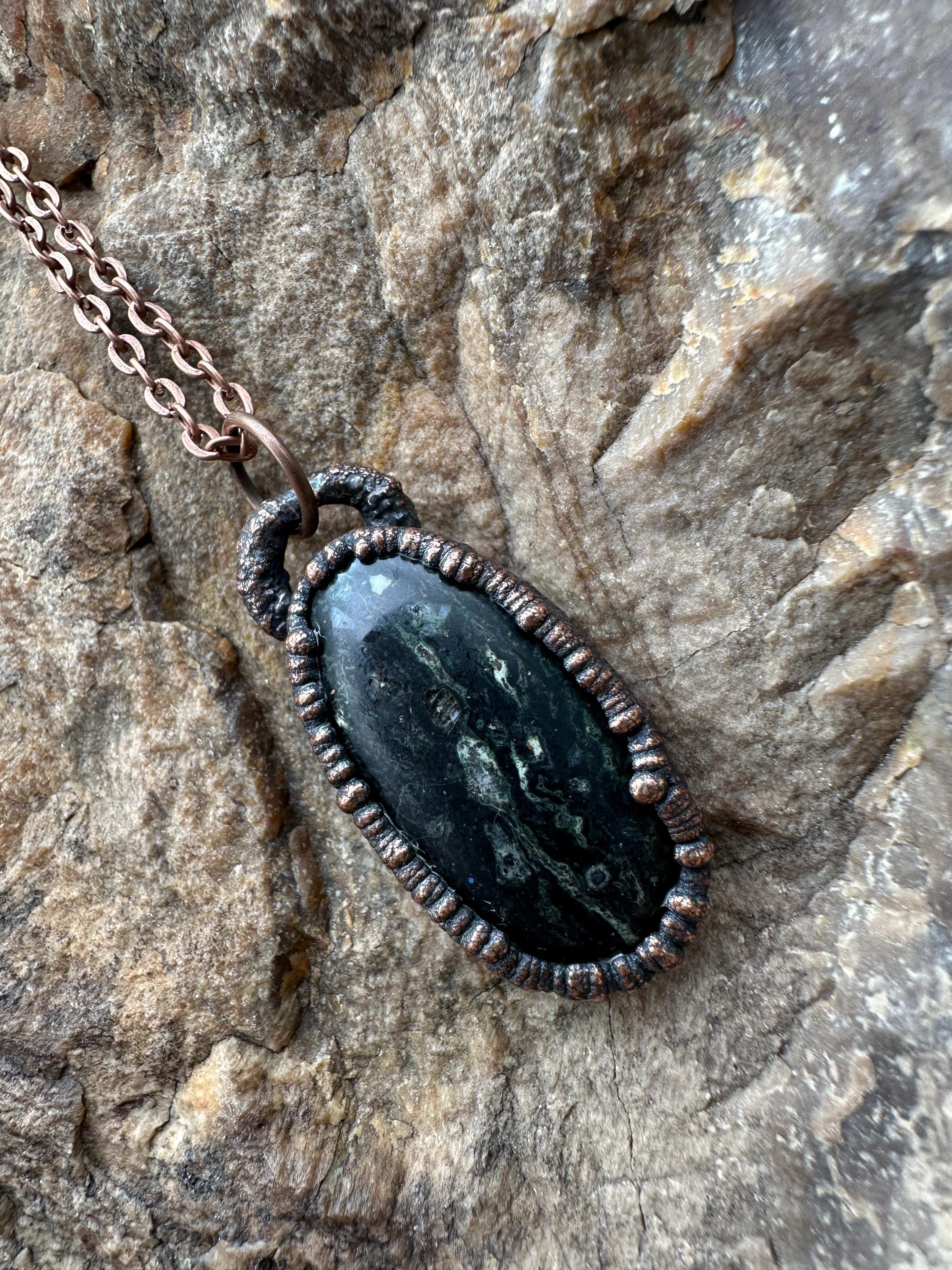 The pendant is framed in a electroformed copper setting, offering a touch of antique elegance that complements any outfit. Whether you’re dressing up for a formal occasion or adding a statement piece to your everyday look, this pendant is versatile and stylish.