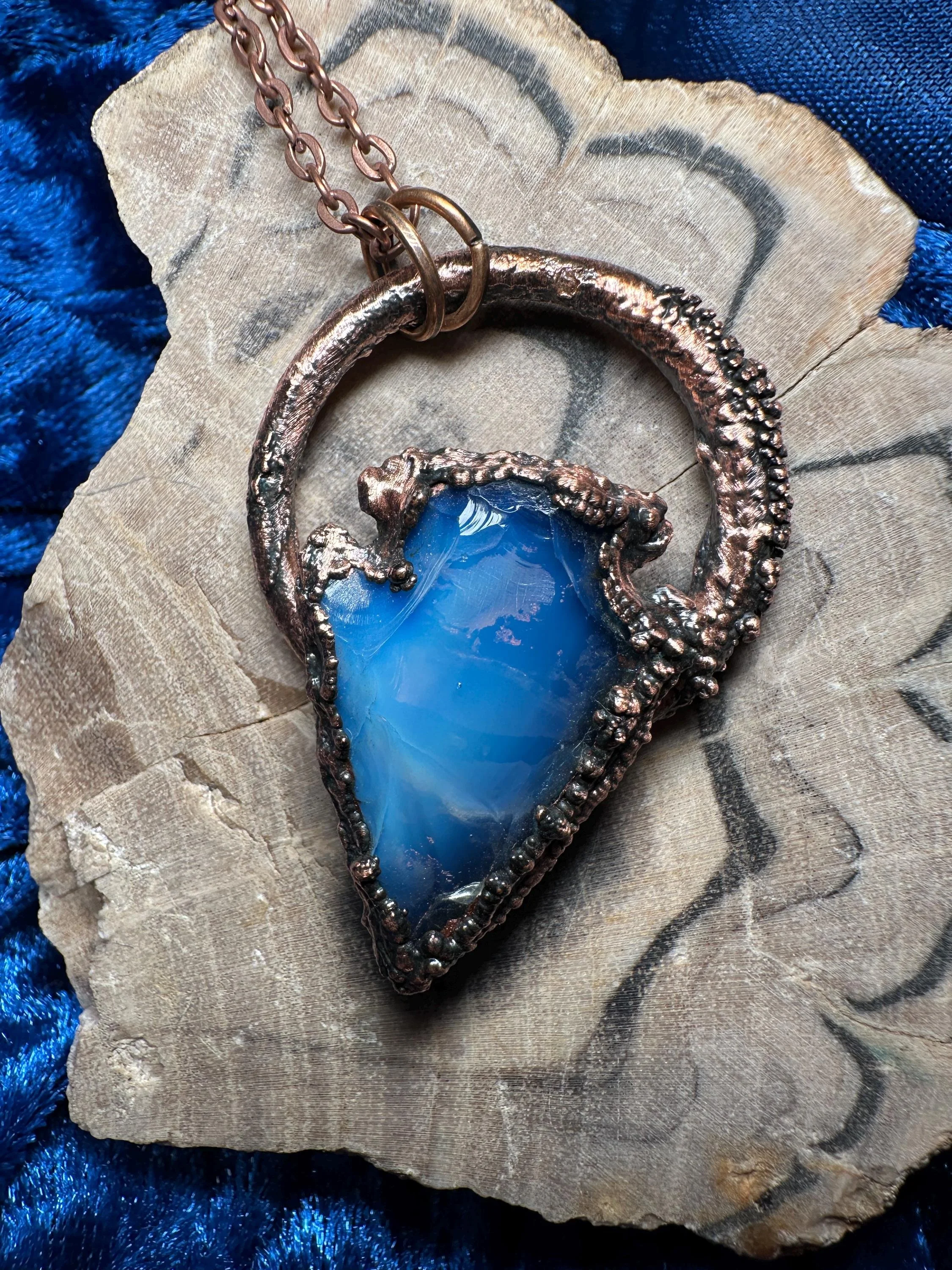 This necklace has a smooth opalite arrowhead with a soft glow that can look blue or warm gold depending on the light. The stone is covered in copper along the edges, which gives it a warm, earthy look.