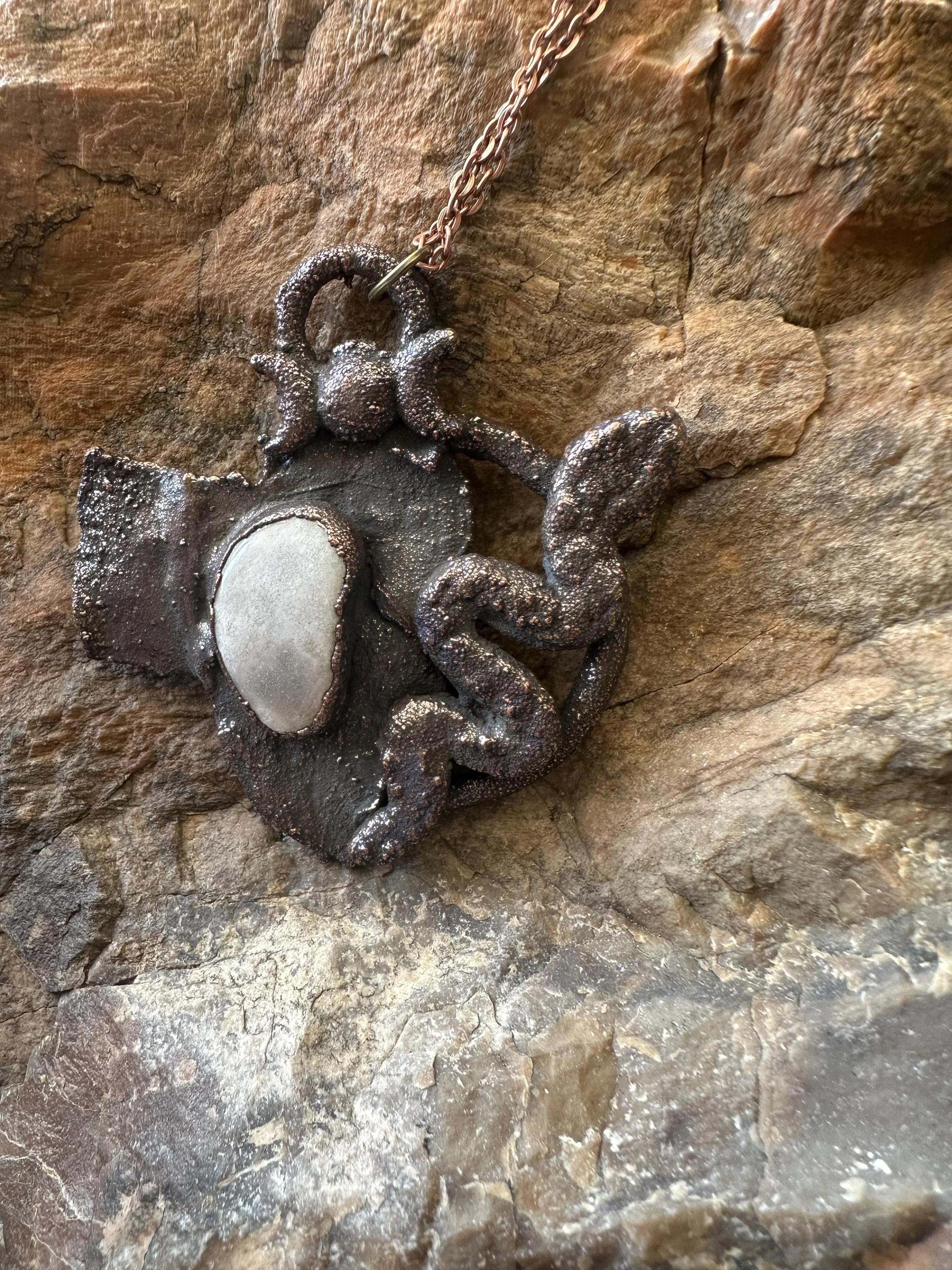 Discover the perfect balance of raw elegance and artisanal craftsmanship with our Rustic Snake and Leaf Copper Pendant Necklace featuring a natural stone centerpiece. This unique statement piece is designed for those who appreciate the beauty of organic textures and earthy tones, making it a versatile accessory for everyday wear or special occasions. This pendant was made from a real leaf that was then electroformed. Crafted with care and attention to detail, this necklace showcases a timeless charm.