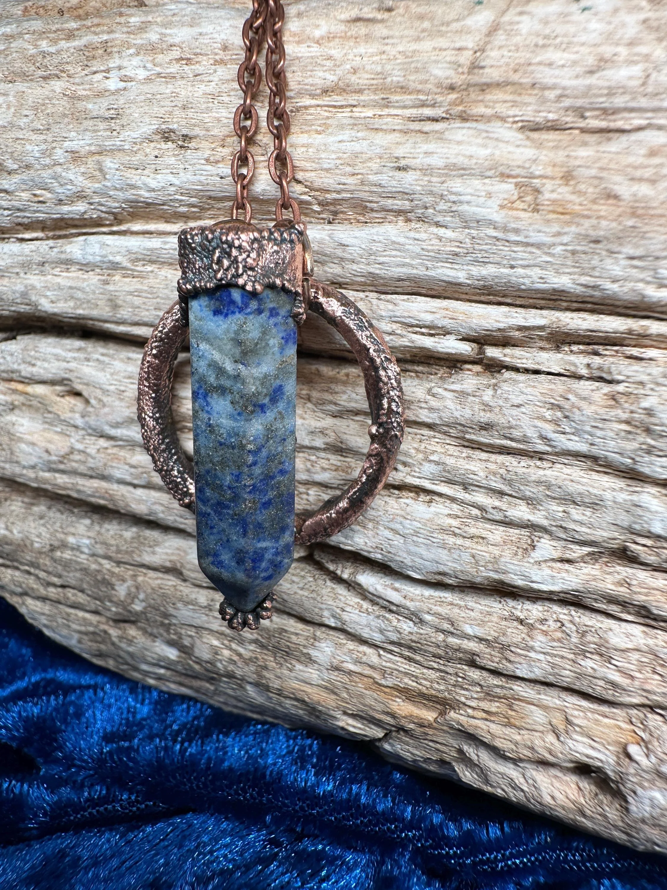 🪶 **Details:** - Lapis Lazuli - Pendant approximate size: 1.5" long x 1" wide - Includes an 18" copper chain - Handmade and one of a kind