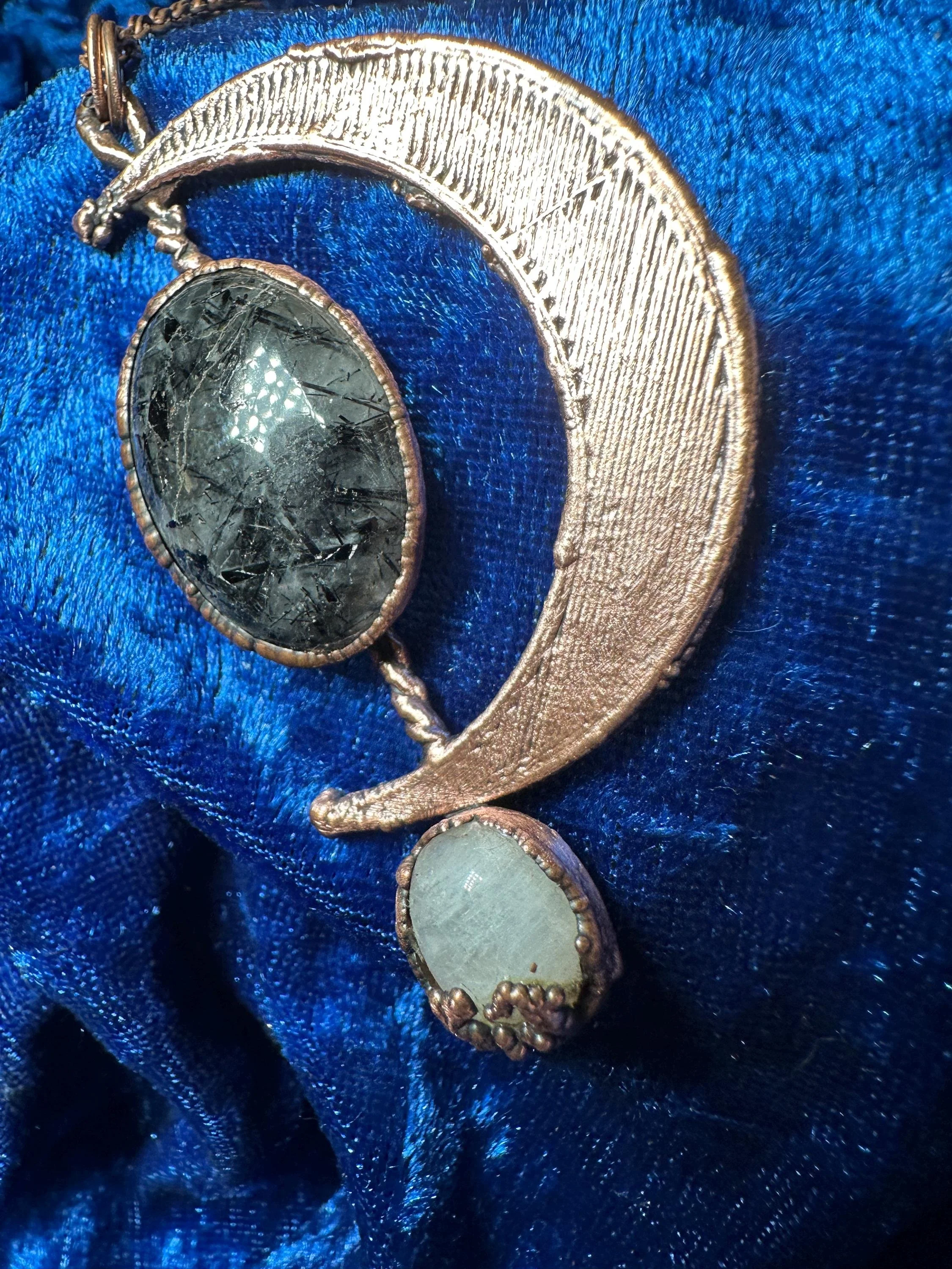 Moon Necklace with Rutilated Quartz and Moonstone | Moonstone Moon Pendant | Unique Quartz Jewelry | Electroformed Stone Pendant