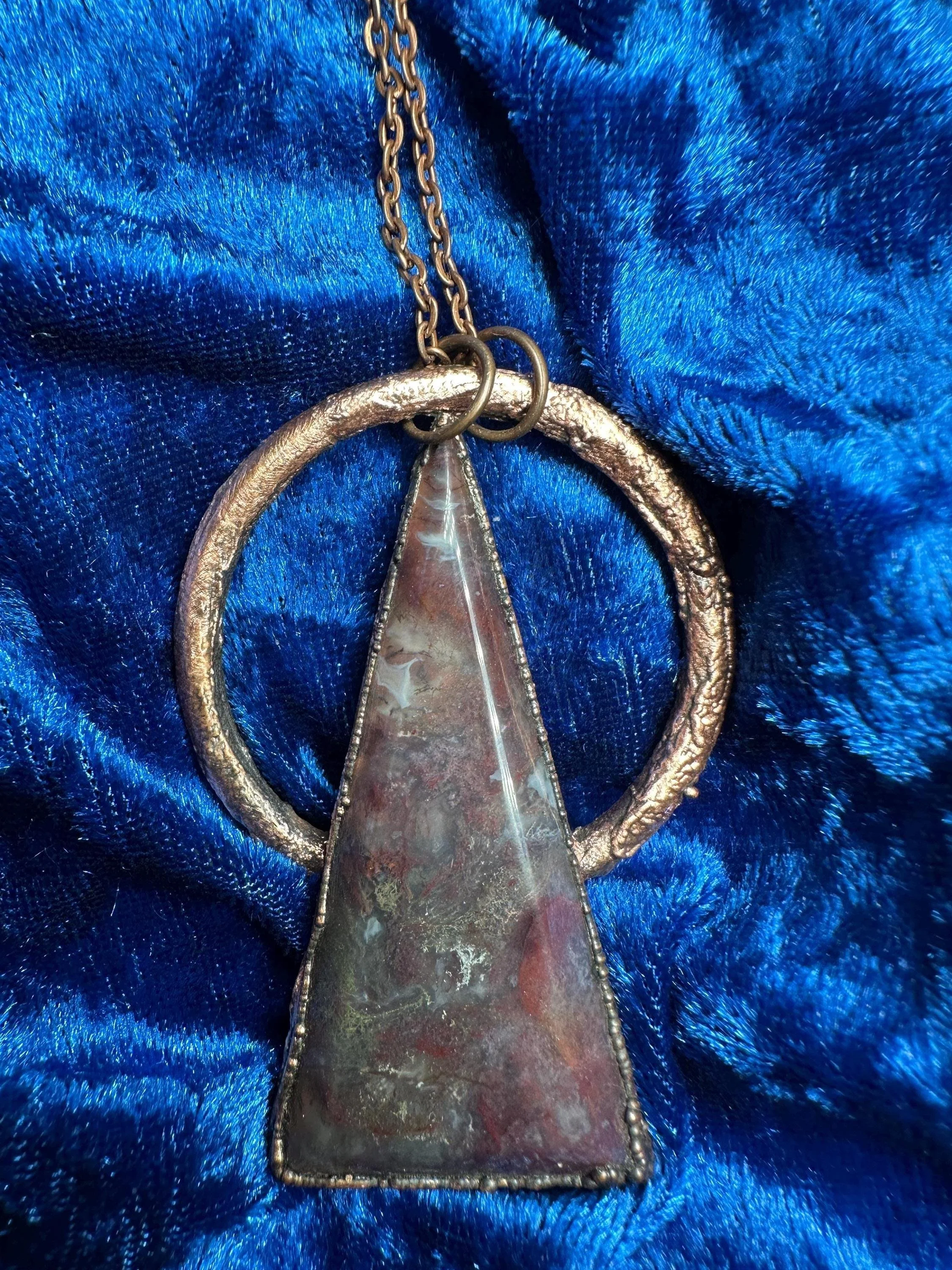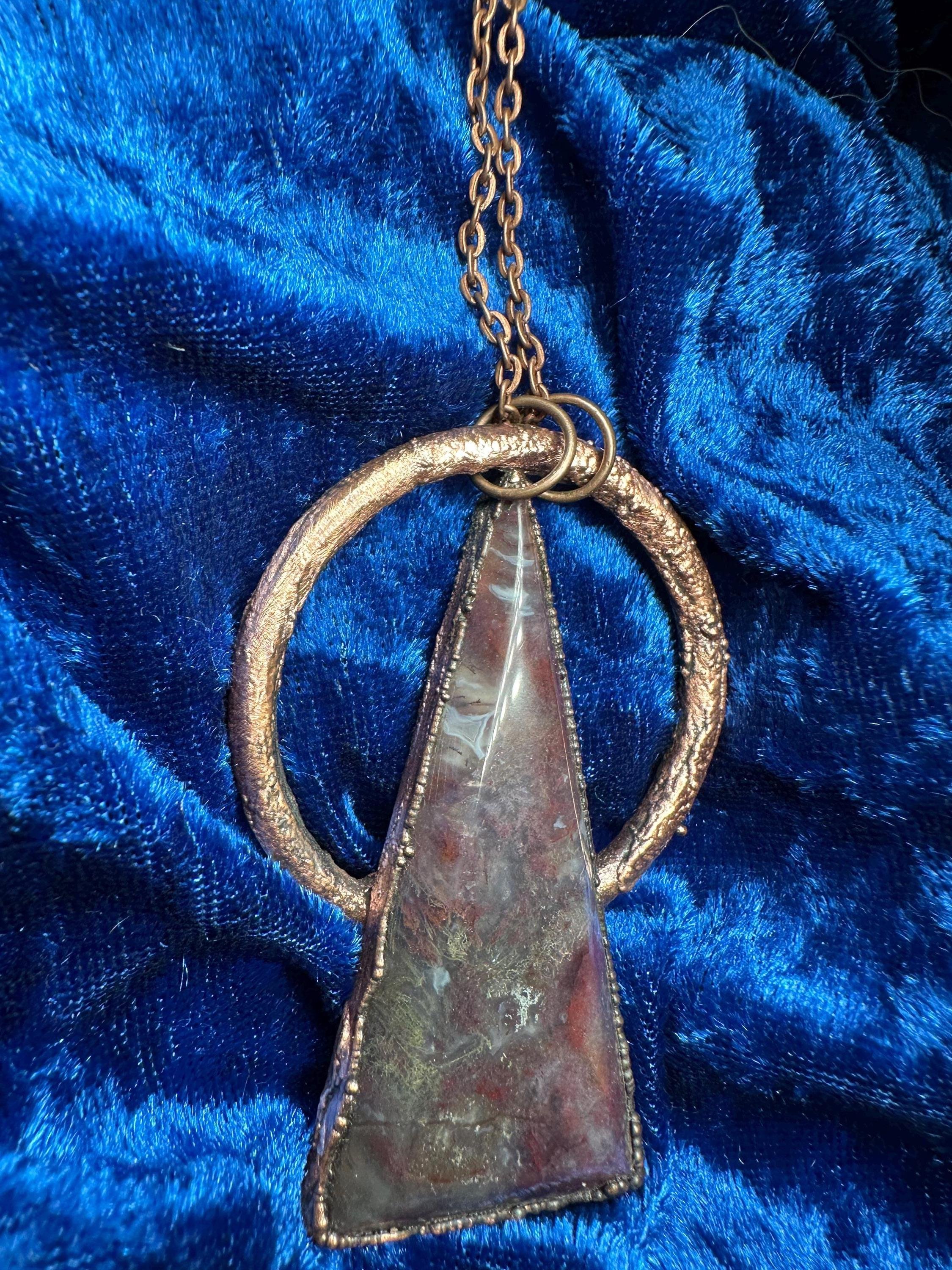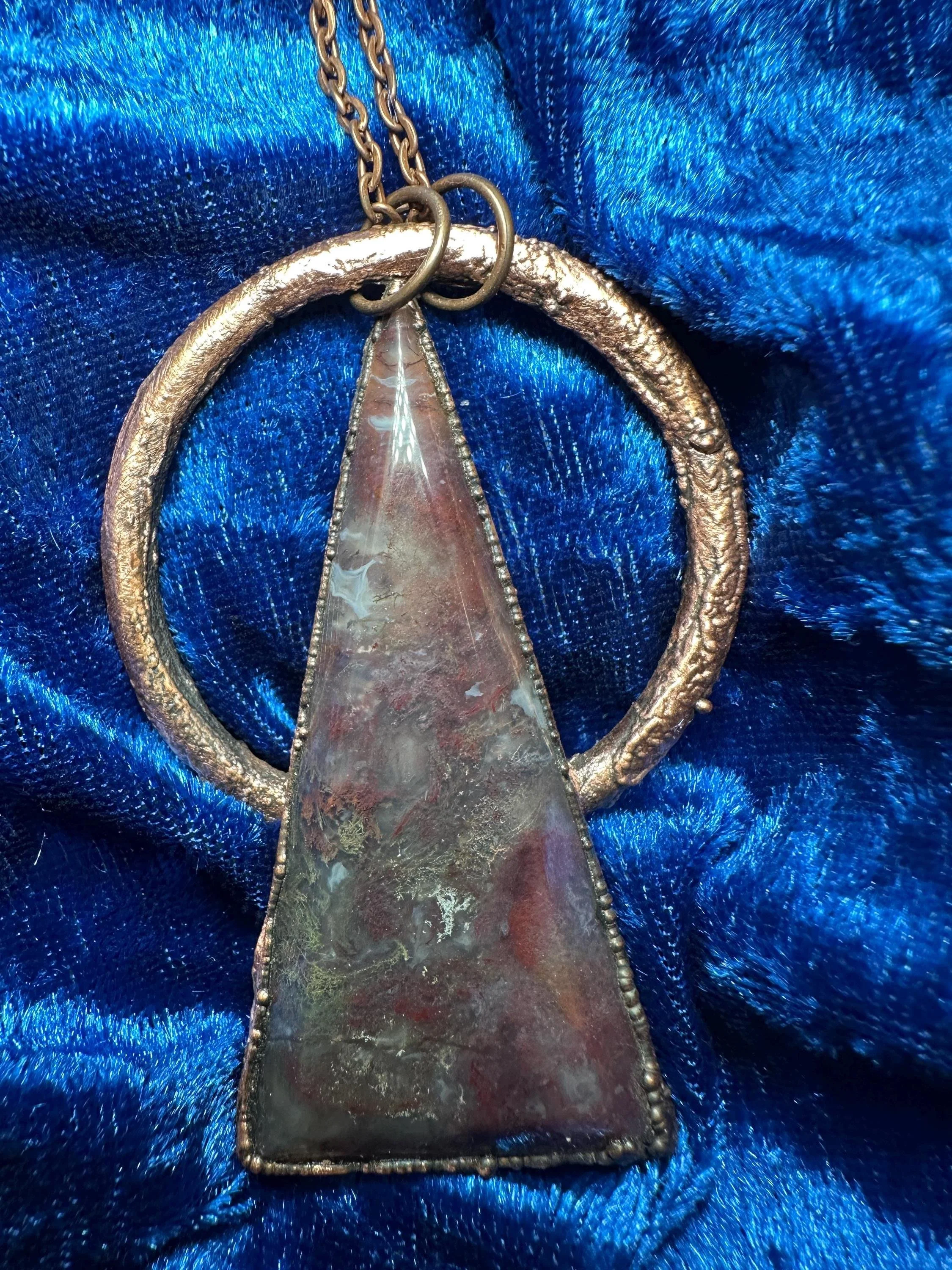Unique electroformed necklace with a triangle moss agate cabochon on a copper ring. Earthy, rustic, and perfect for everyday wear.