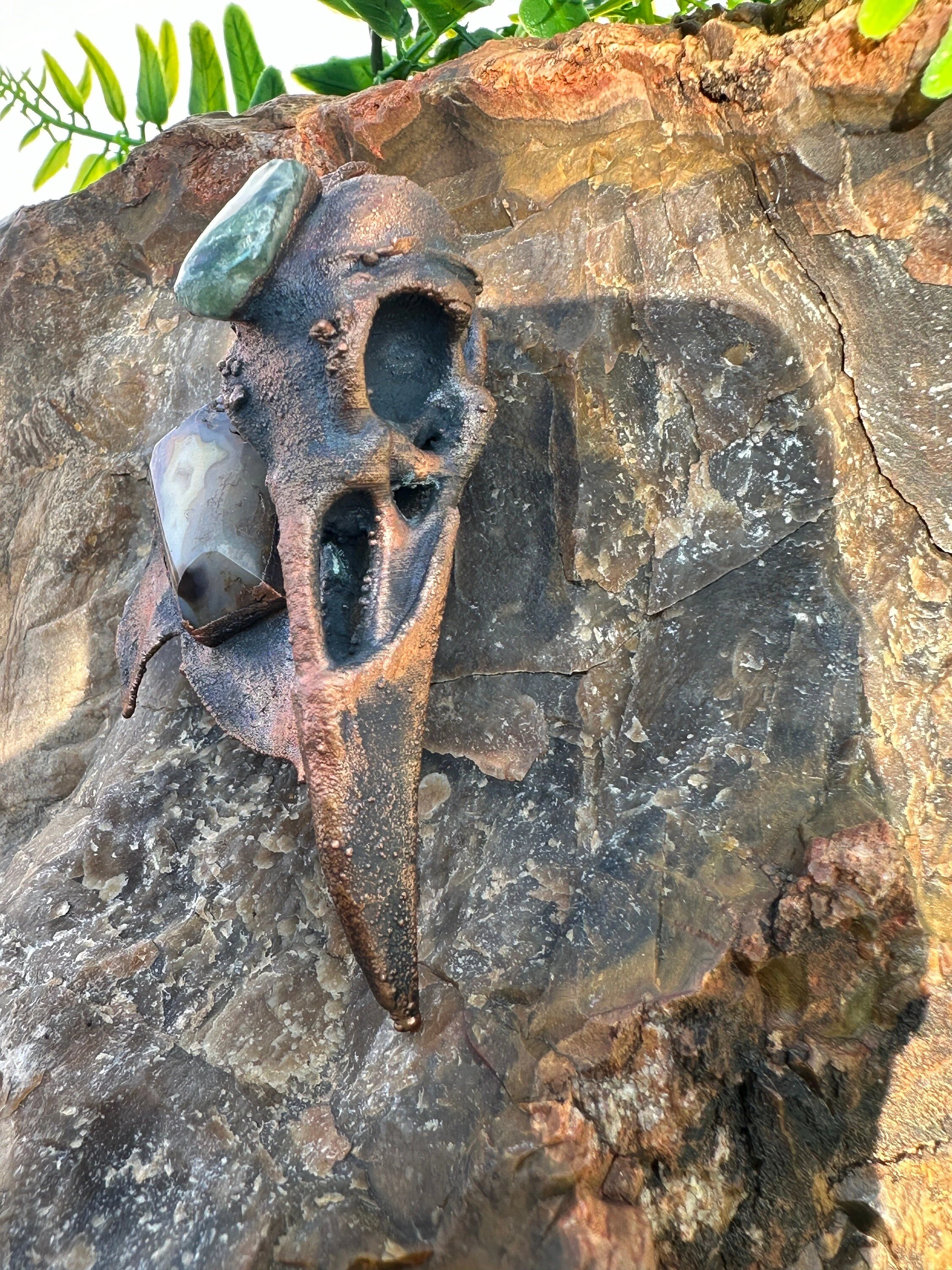 Raven Skull Necklace With Real Leaf Pendant | Green Apatite And Skull Agate Charming Necklace | Bird Skull Copper Necklace | Gothic Jewelry