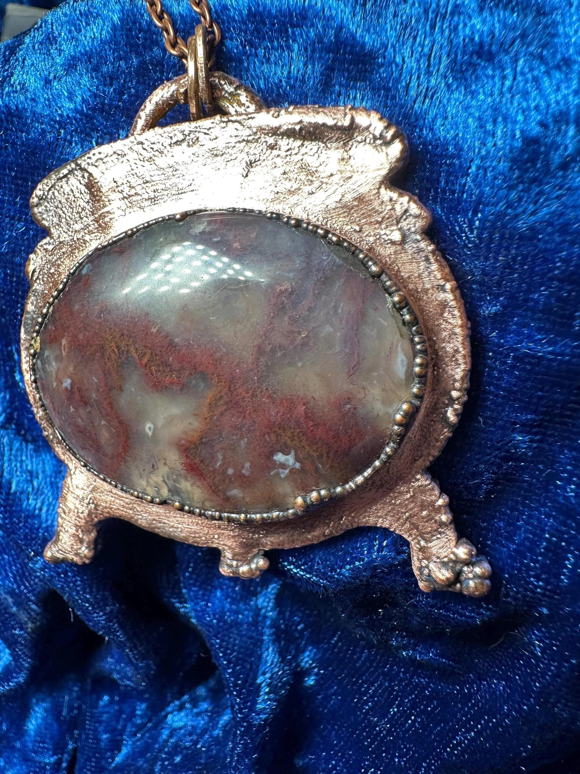 ðŠķ **Details:** - Electroformed Cauldron with Moss Agate cabochon - Moss Agate is from Alpine, Texas - Pendant size: 2.25" long x 2" wide - Includes an 18" copper chain - Handmade and one of a kind