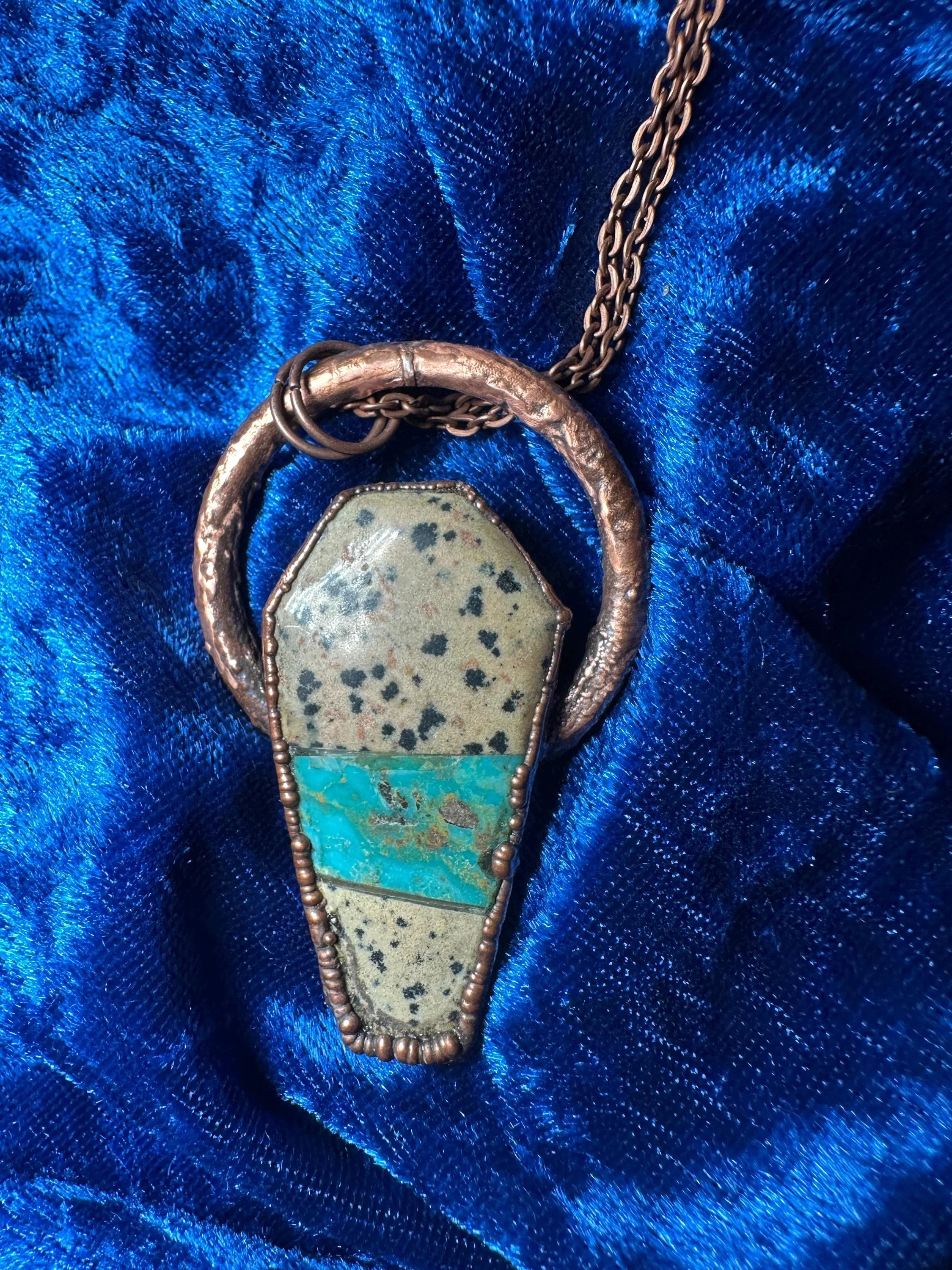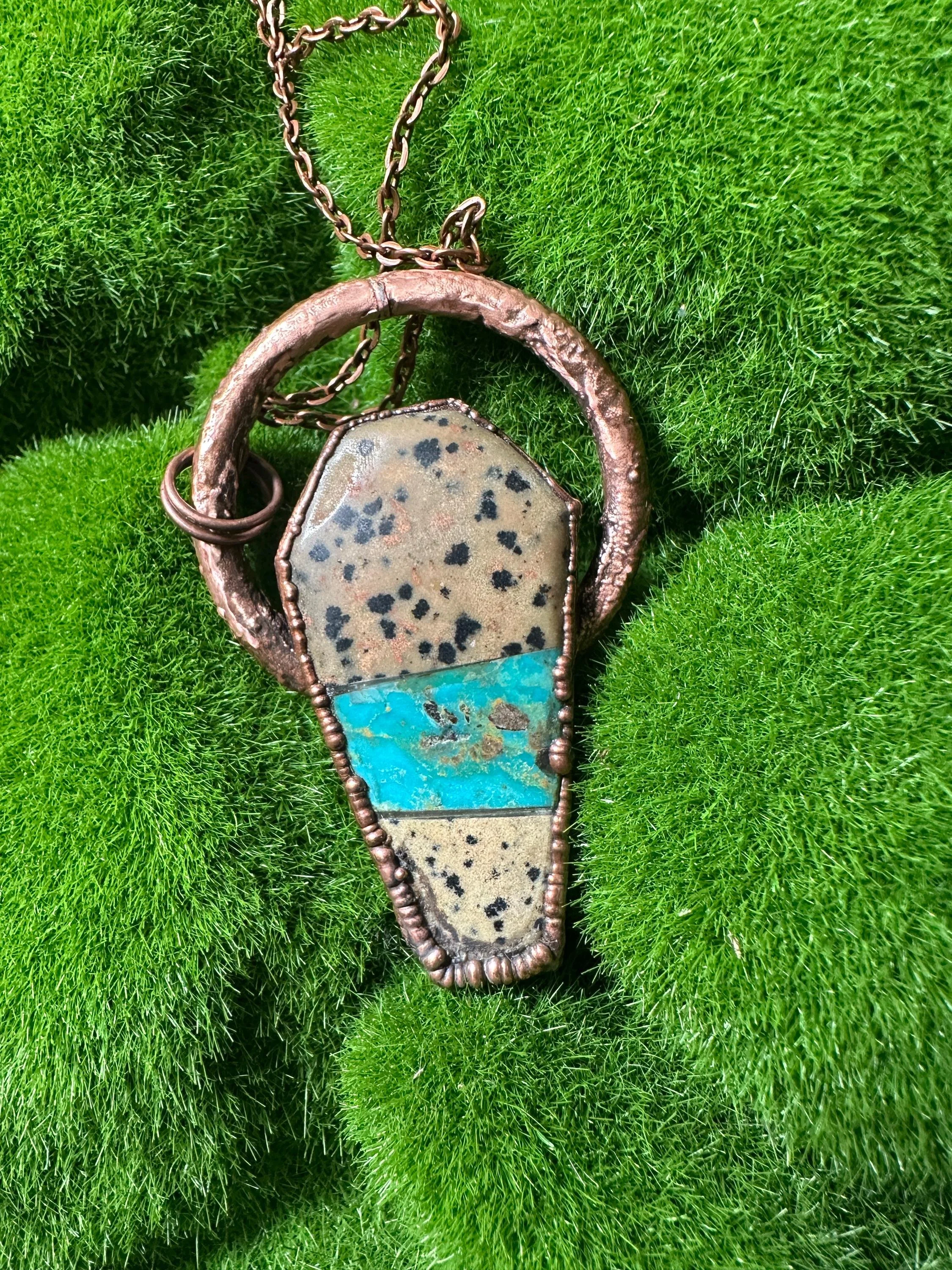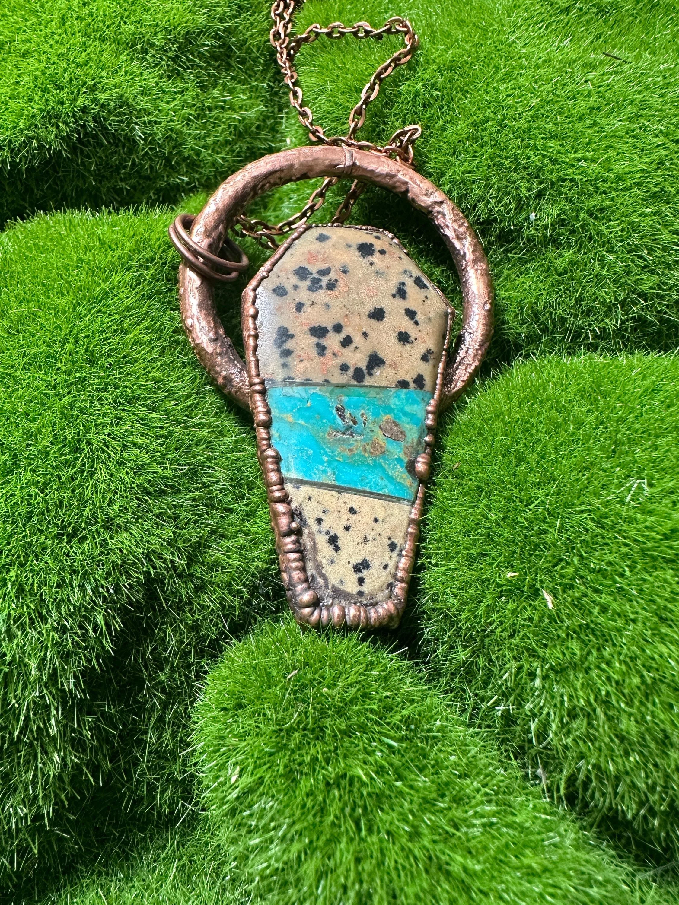Gorgeous turquoise and dalmation jasper coffin pendant that is electroformed in copper