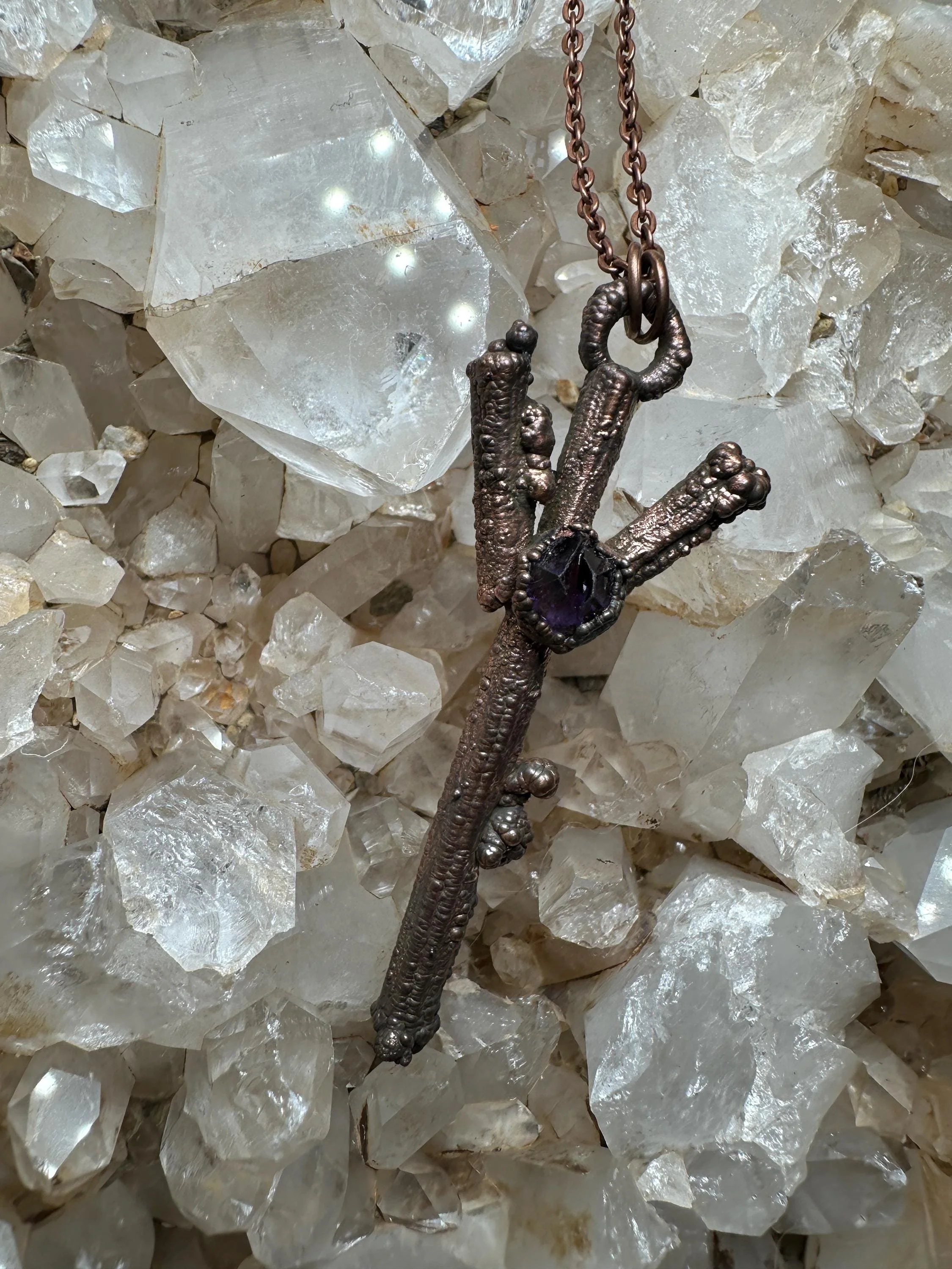 This unique pendant features real sticks electroformed in copper and arranged into the shape of the Algiz rune, an ancient Norse symbol representing protection, spiritual connection, and guidance. In the center sits a pointed amethyst stone, adding a touch of mystical energy and a pop of deep purple color.