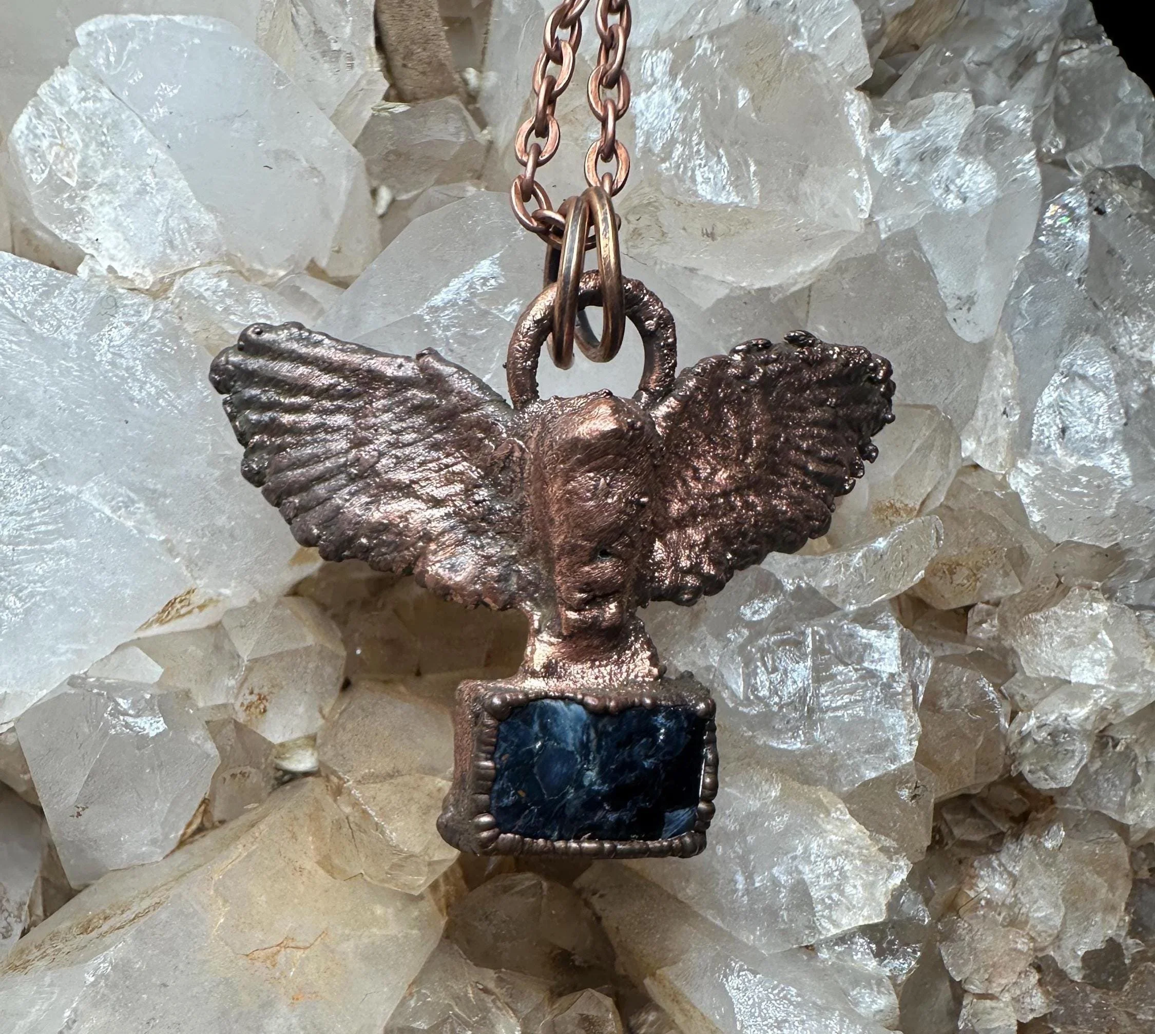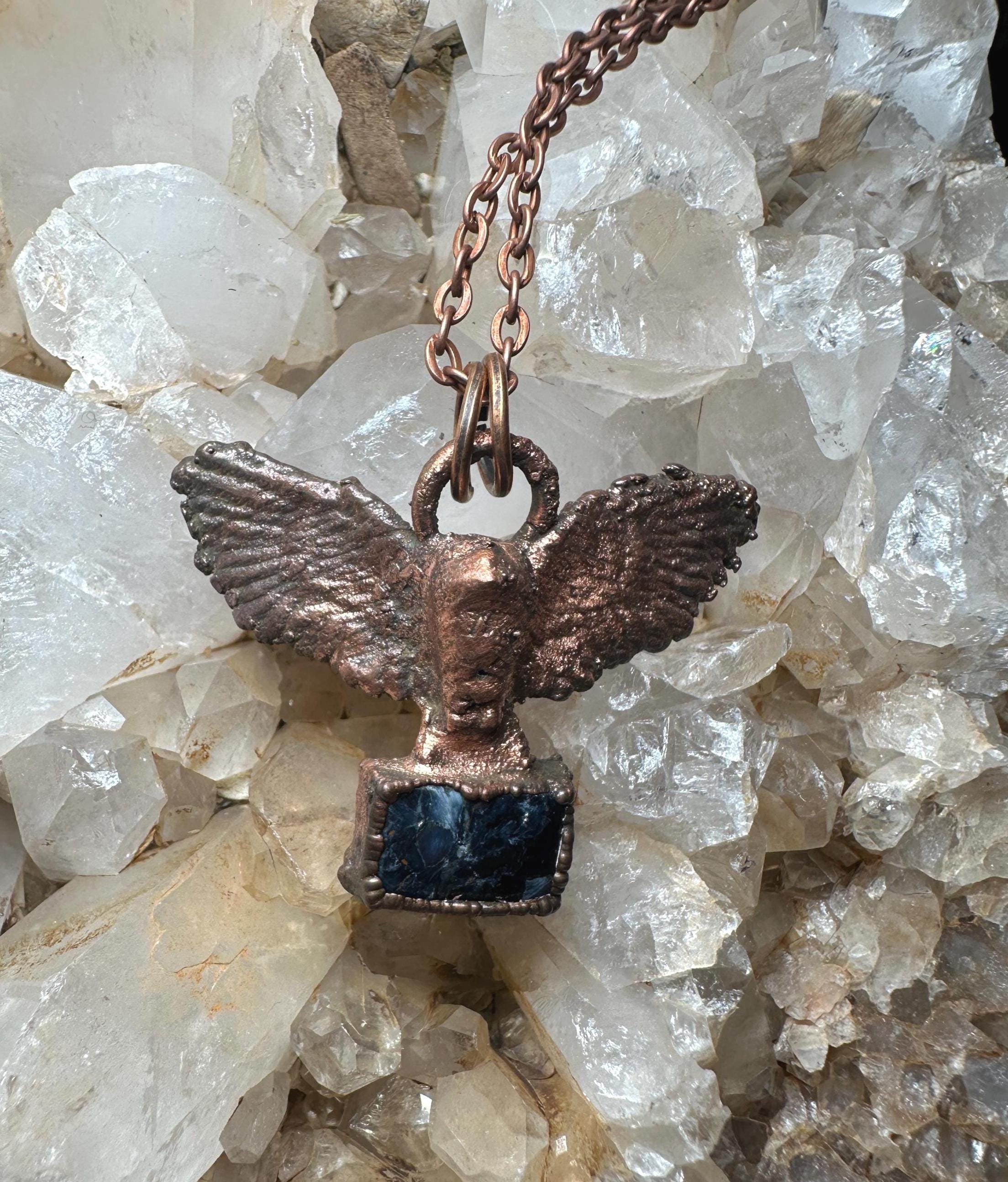 Electroformed Flying Owl Pendant | 3D Printed Copper Owl with Pietersite Gemstone | Owl Gift | Forest Lover Gift