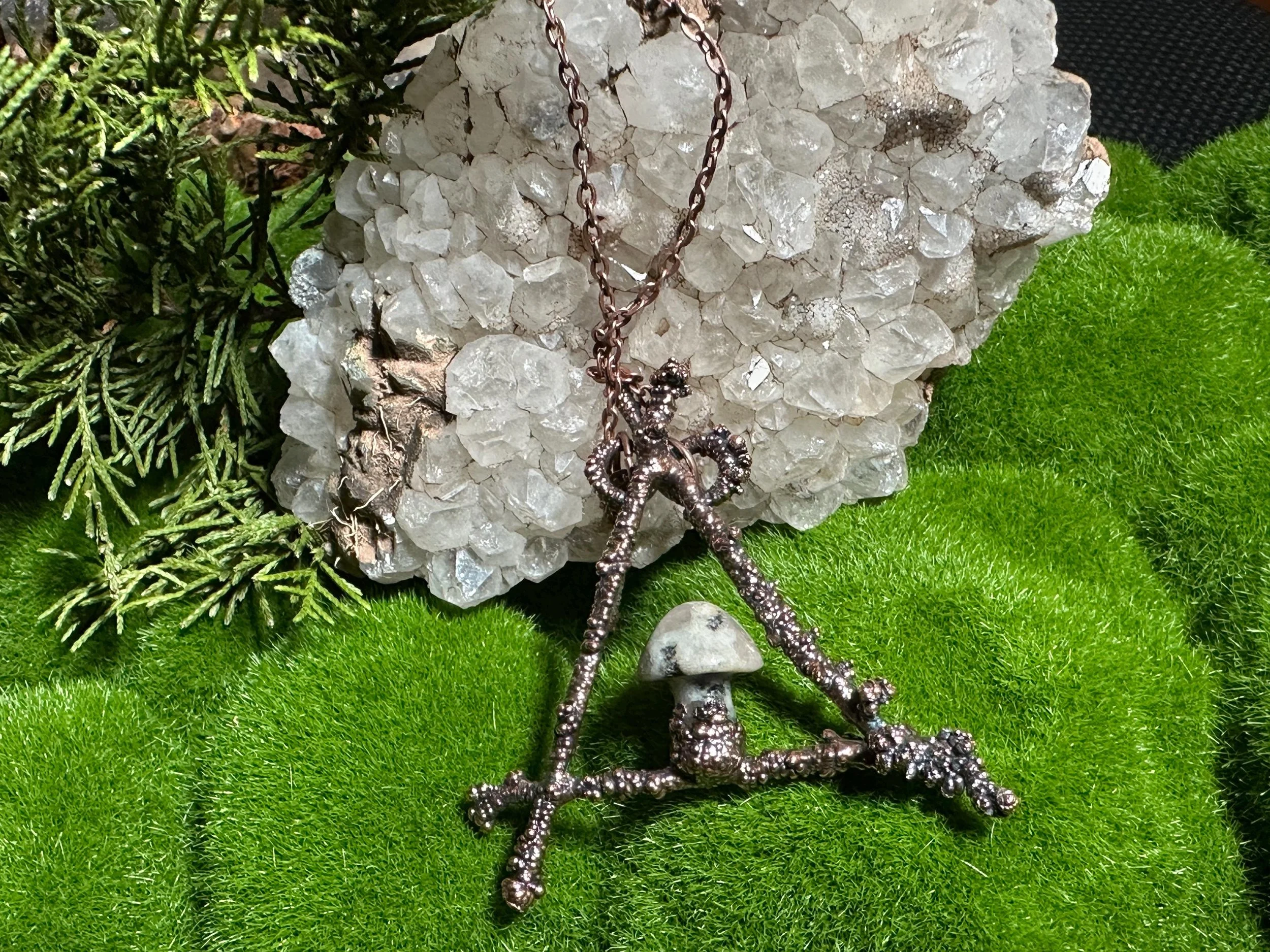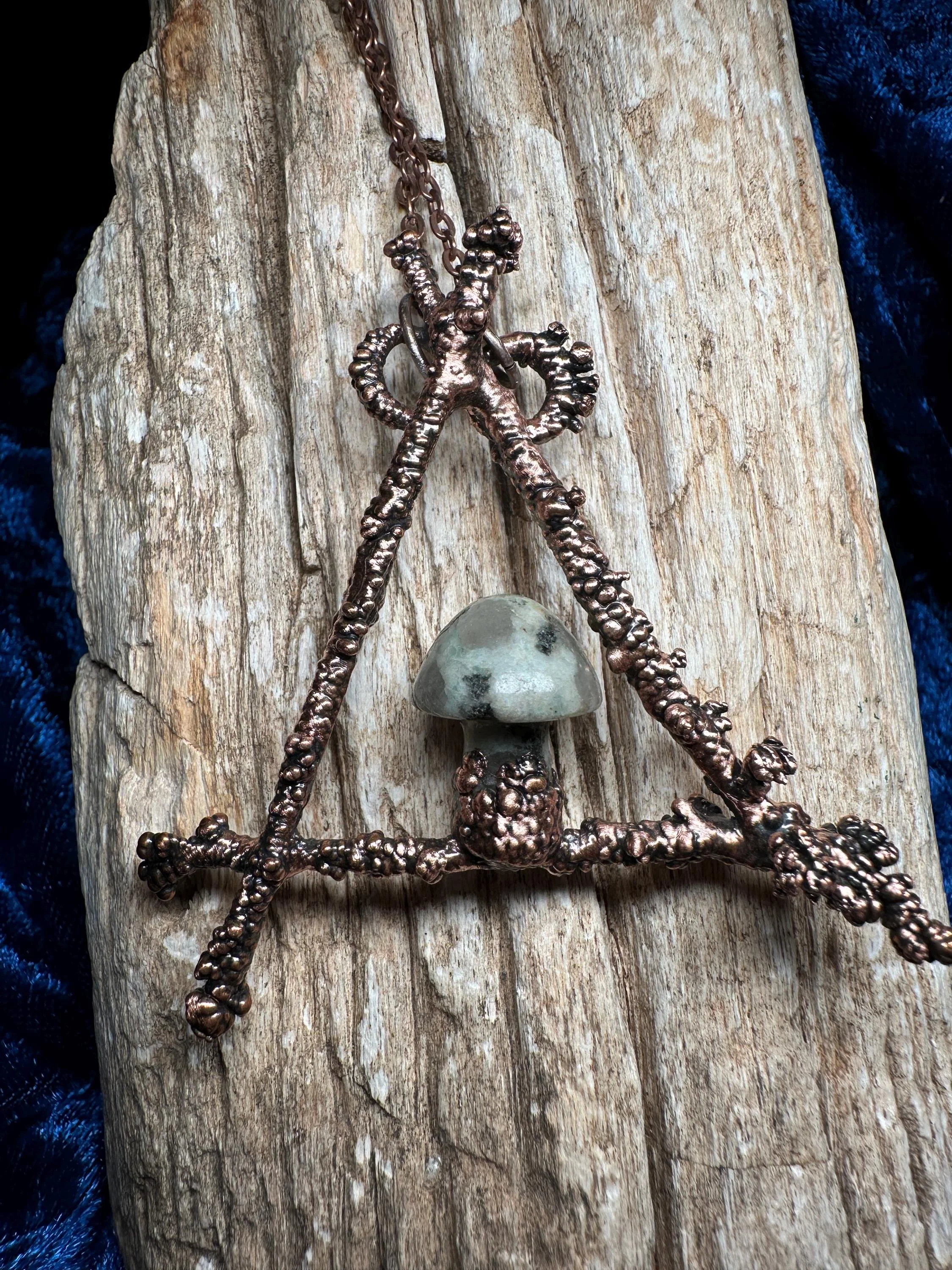 This one-of-a-kind necklace features a pendant handcrafted from pine twigs, artfully arranged into a mystical triangle design. At the heart of the pendant lies a polished labradorite mushroom, glowing with its signature iridescent flash. The natural pine twigs are electroformed in copper and antiqued with patina, giving the piece an earthy yet magical finish.