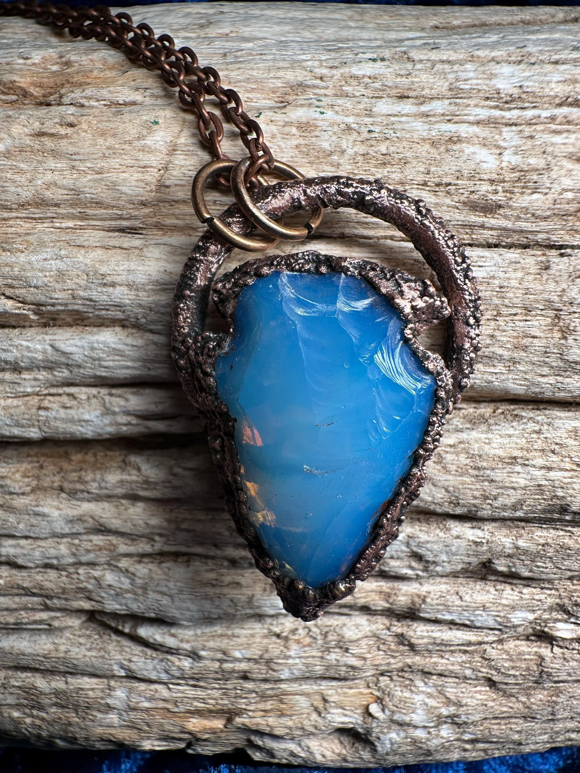 This necklace has a smooth opalite arrowhead with a soft glow that can look blue or warm gold depending on the light. The stone is covered in copper along the edges, which gives it a warm, earthy look.